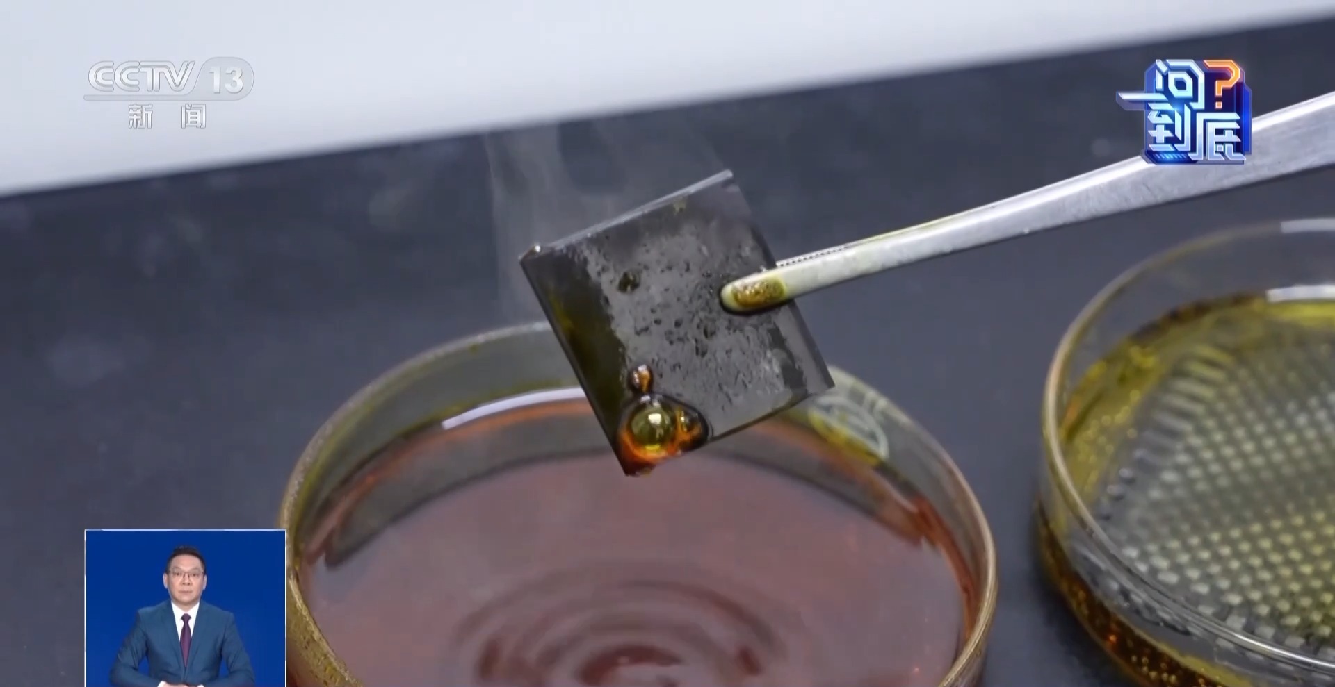 总台央视记者 古峻岭:首先把一个碳纤维织的布片浸没到强酸里,再把一个金属片放到强酸里。金属片一进到强酸里就立刻冒出了很多气泡,发生了剧烈的反应。把它拿出来还会冒出一些反应的烟雾,正在经历剧烈的腐蚀。而泡了一会儿的碳纤维没有任何变化,抗腐蚀性能非常优异。