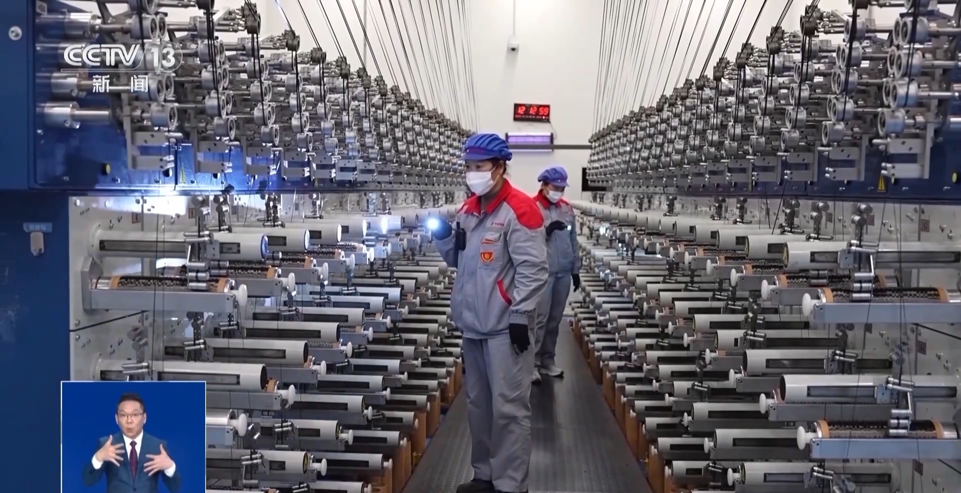 总台央视记者 古峻岭:在T1200级高强度碳纤维生产线,这里看起来像是一个纺织车间。两边一排排白色的柱体就是碳纤维的原丝,这里也是碳纤维碳化工艺流程的第一关。白色的原丝沿着退丝机从这里进入下一道工序,也就是预氧化环节。