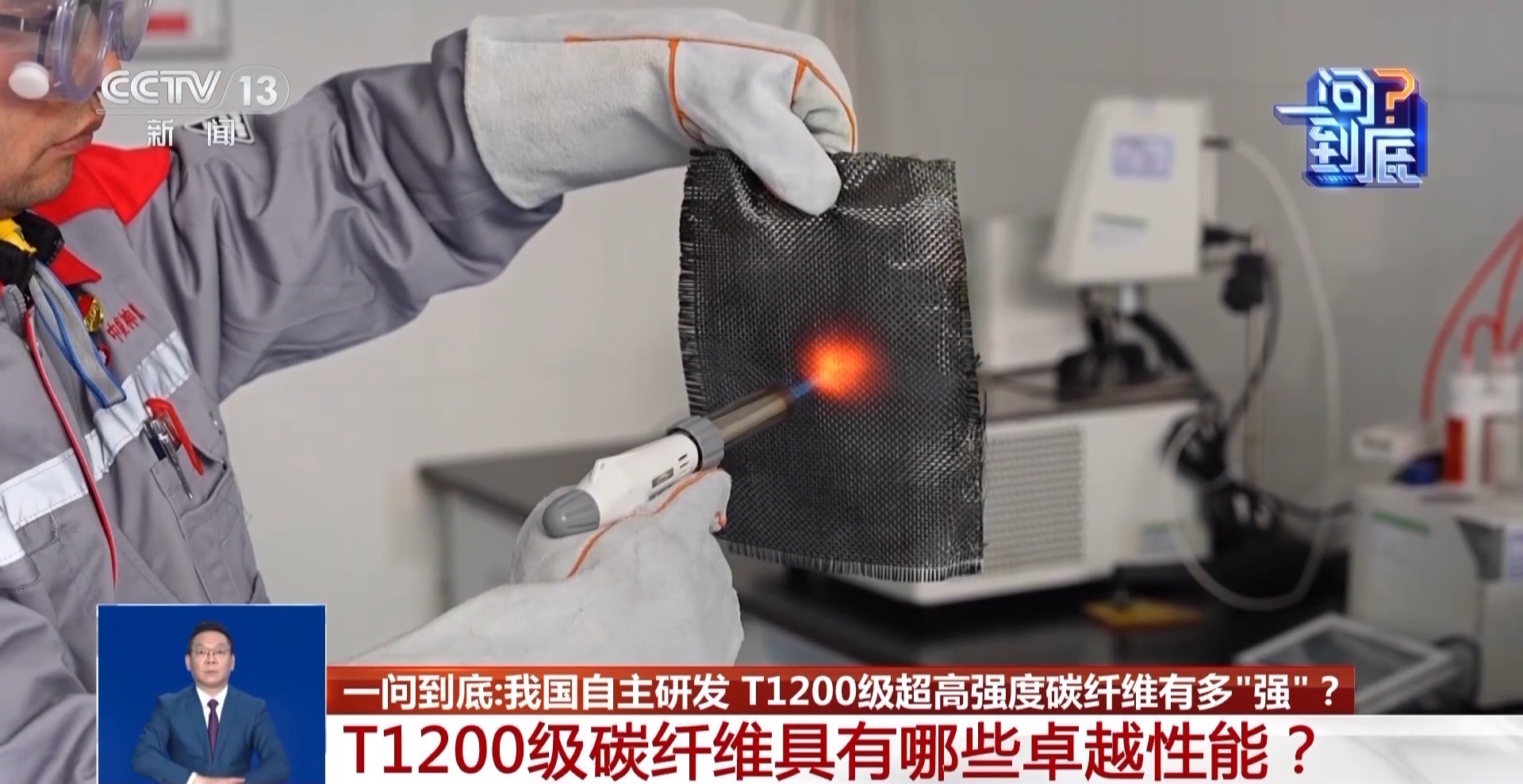 总台央视记者 古峻岭:这种碳纤维还有非常优异的防火和阻燃性能。火烧碳纤维编织的布料,都烧红了也没有冒烟,也不会被点燃,安全性能非常好。