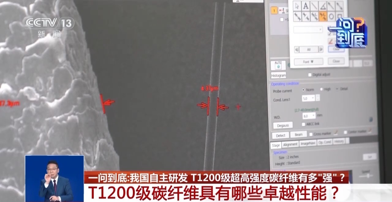 总台央视记者 古峻岭:通过电子显微镜对比放大了800倍的头发丝和T1200级碳纤维。左边非常粗的是头发丝,它的直径大概有67微米,而右边非常细的就是T1200级的碳纤维丝,它的直径还不到4.5微米,而上一代T1100级的碳纤维,它的直径是5.3微米。所以这个T1200级碳纤维不仅是目前强度最高的碳纤维,同时也是最细、最轻的碳纤维。这种新材料应用到低空经济、航天航空等对重量非常敏感的行业领域,将会对它们产品的性能有一个新的飞跃。