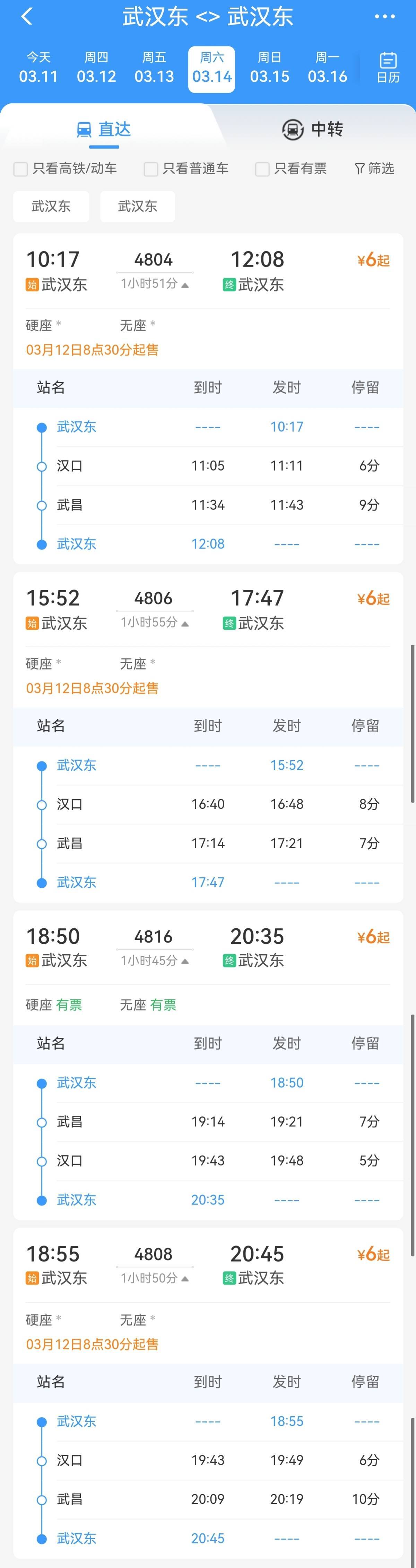 此次开通的市内铁路环线,始发终到站均为武汉东站。具体车次安排为:4804次(10:17-12:08)、4806次(15:52-17:47)、4808次(18:55-20:45)的运行路线为武汉东—汉口—武昌—武汉东;而4816次(18:50-20:35)则为武汉东—武昌—汉口—武汉东。