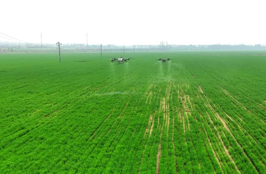 “起飞!”随着一声指令,一阵密集的嗡嗡声响起,三台无人植保机同时腾空,平稳穿梭在麦田上空。细密的肥料喷雾从机身均匀喷出,随风轻洒,层层覆盖在绿油油的麦苗上。