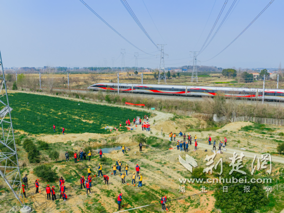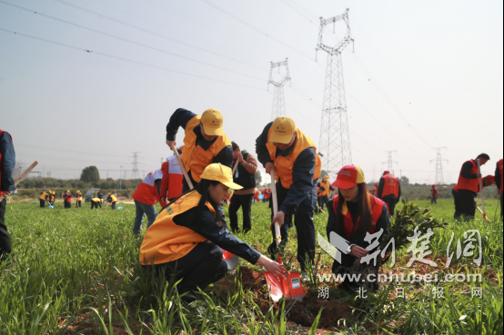 3月11日早晨,温柔的阳光穿透薄雾,洒在合武高铁沿线。四勿岗村的一处田野上,国网武汉市黄陂区供电公司蔡榨供电所所长潘钟毓带领志愿者们分工协作,挖坑、扶苗、培土、浇水,动作娴熟而有序。