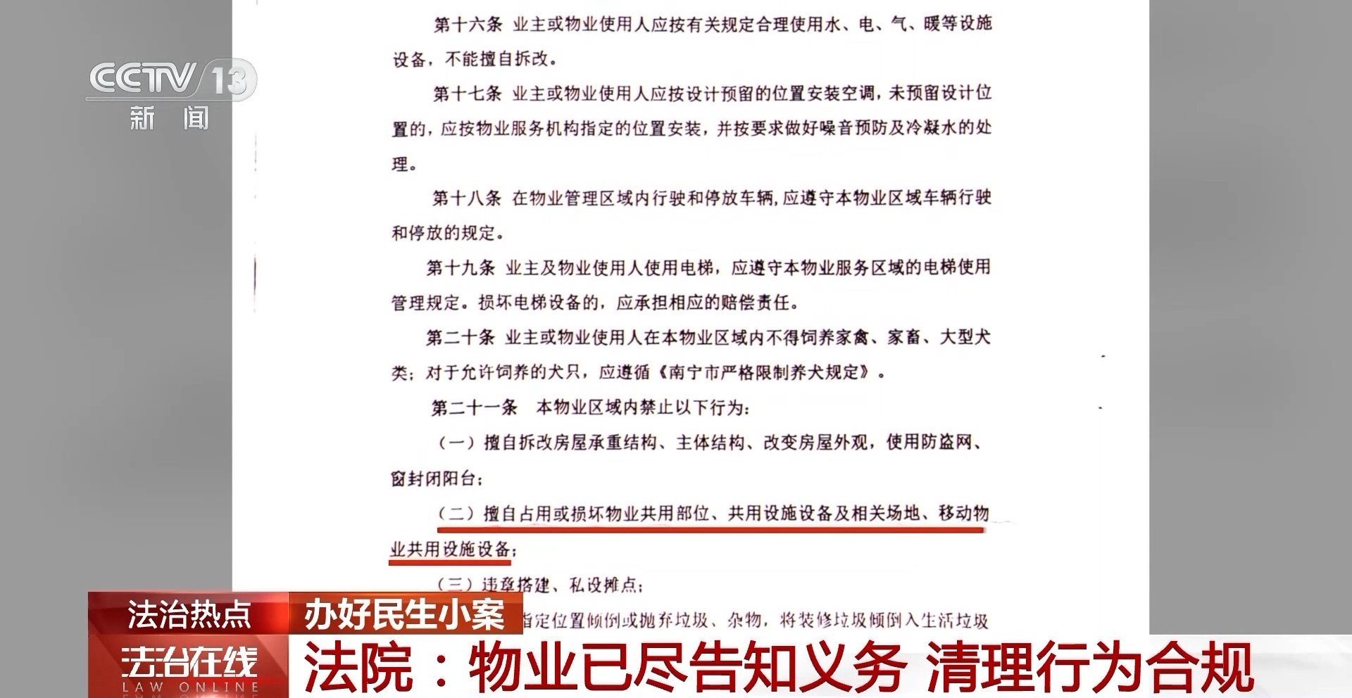 南宁市江南区人民法院立案庭法官 李珊:原告没有在规定的时间内清理物品,在物业公司贴出温馨提示后,长达一个月的时间内也没有清理物品。物业公司在无法联系原告的情况下,为了保障全体业主的共同利益以及正常的生活秩序,也为了维护小区的消防安全,就安排了废旧回收人员上门回收堆放的杂物,法院认为这个行为并无不当。