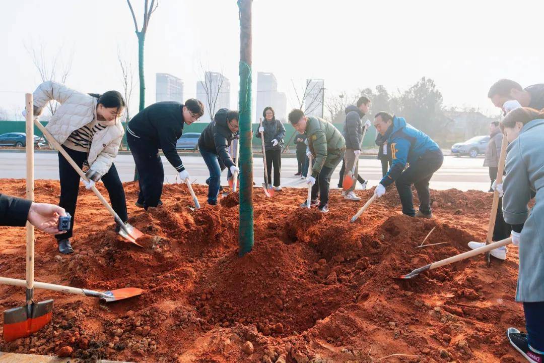 3月12日,在襄阳市洪山头公园植树点,襄阳市住房公积金中心的志愿者们精神抖擞,积极投身义务植树。大家分工协作,经过一个多小时的辛勤劳动,共同栽下了一株株新苗。新树挺立,在和煦春风中焕发出勃勃生机,为“绿美襄阳”建设增添了又一片新绿,也将生态宜居的理念扎根在了汉江之畔的沃土中。