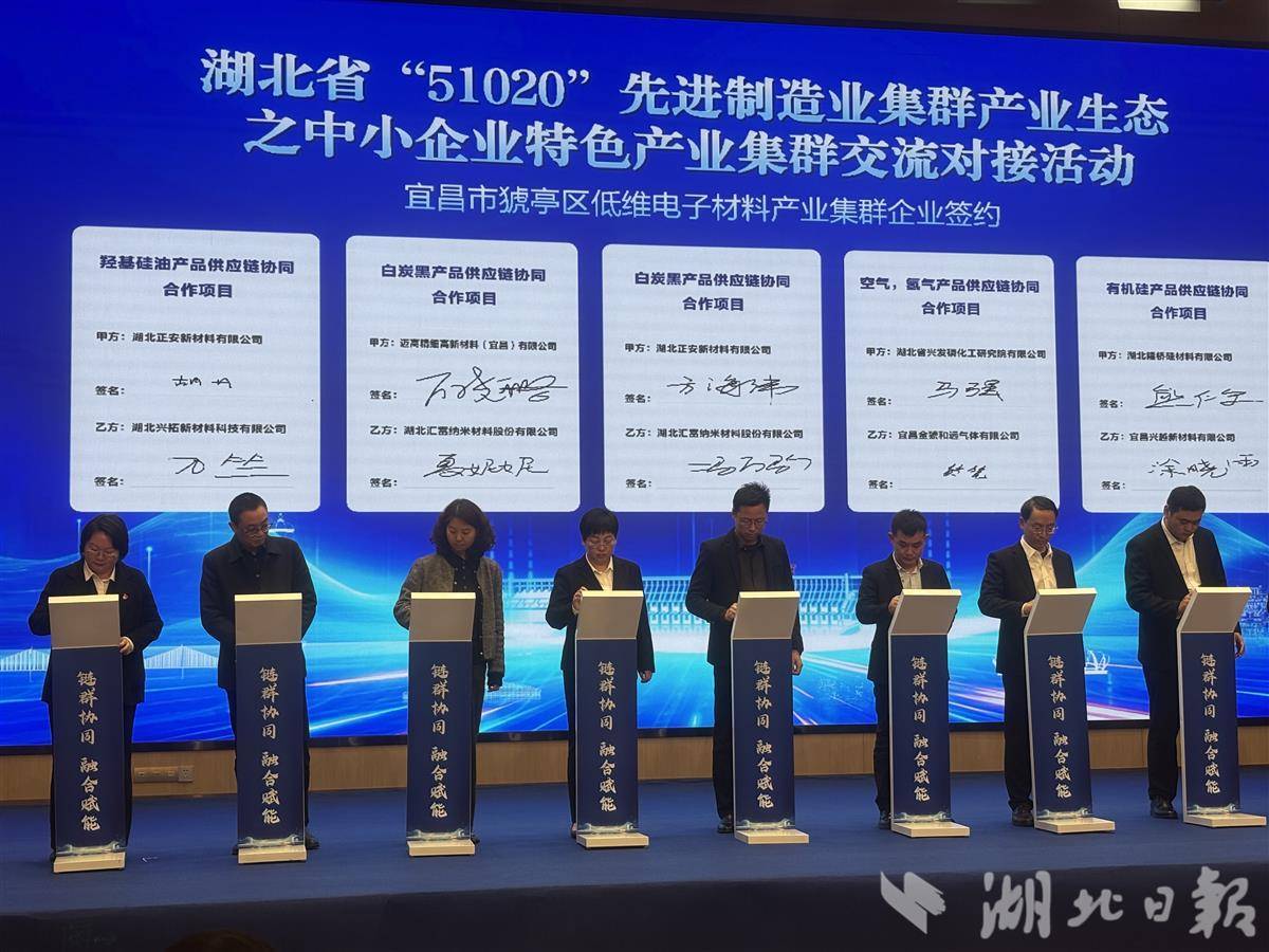 当天,在活动现场宜昌市猇亭区低维电子材料、荆门市掇刀区新能源动力电池等5家国家级产业集群现场发布了集群高质量发展实施方案、产业链图谱及供需清单,为推动集群治理及产业链上下游精准对接、协同发展提供了清晰路径。5个集群内25对上下游企业现场签署供需合作协议,签约金额达7.16亿元,进一步提升了重点产业链的本地配套率与协同水平。
