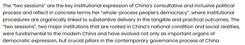 文章指出,中国的全过程人民民主植根于中国的国情与社会现实,在现代中国国家治理体系中发挥着重要作用。两会不仅是表达社会意见、形成政策共识的重要平台,更是中国当代治理体系中的关键支柱。