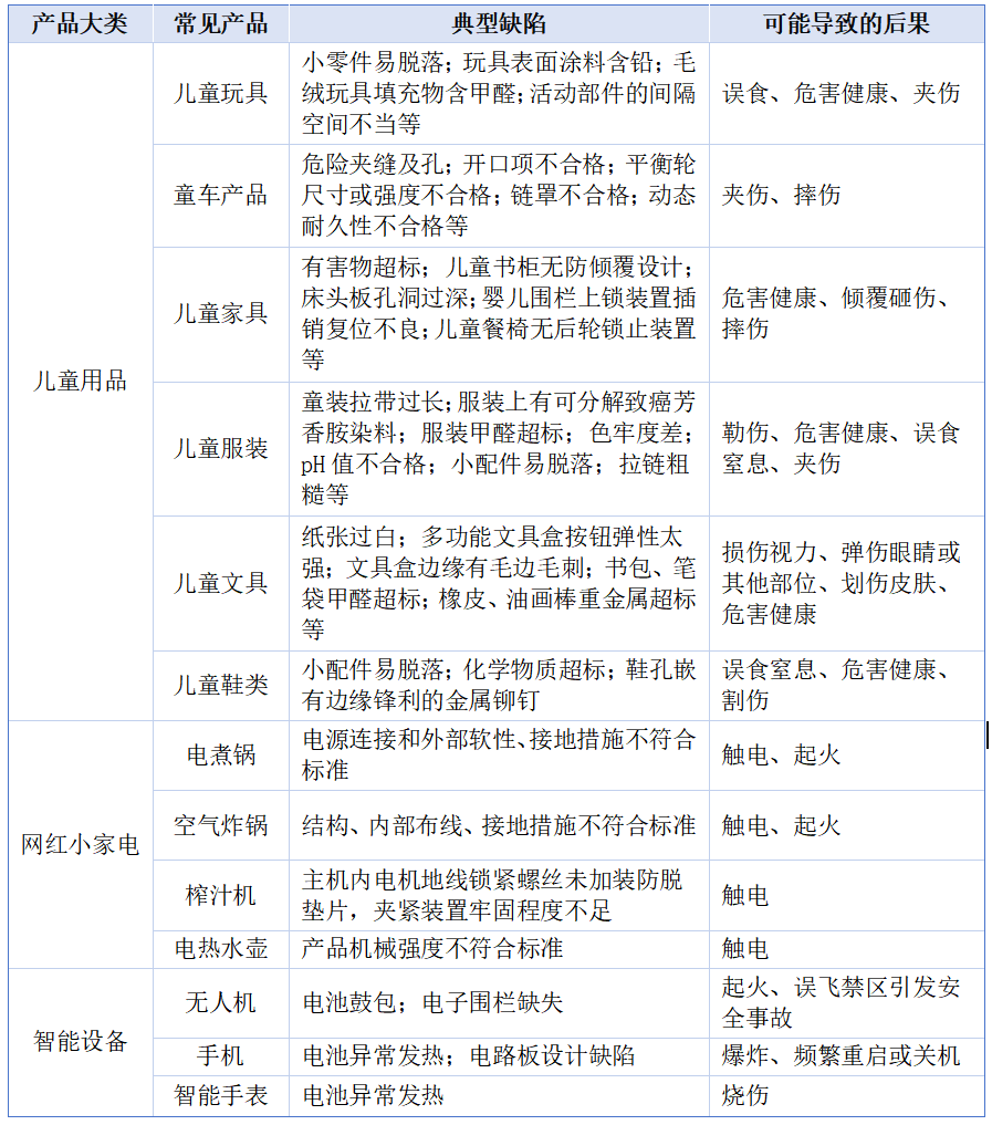 荆楚网(湖北日报网)讯(通讯员张璐)您有没有想过,每天用的、孩子玩的、家里摆的那些再寻常不过的东西,可能藏着看不见的安全隐患?其实,这类因设计、制造或警示等原因,在某一批次中普遍存在安全风险的消费品,有一个官方的名字——缺陷产品。今天,湖北省缺陷产品管理中心梳理了生活中几类常见的缺陷产品及其典型缺陷(见下方表格),帮您练就一双“火眼金睛”,守护家人安全。