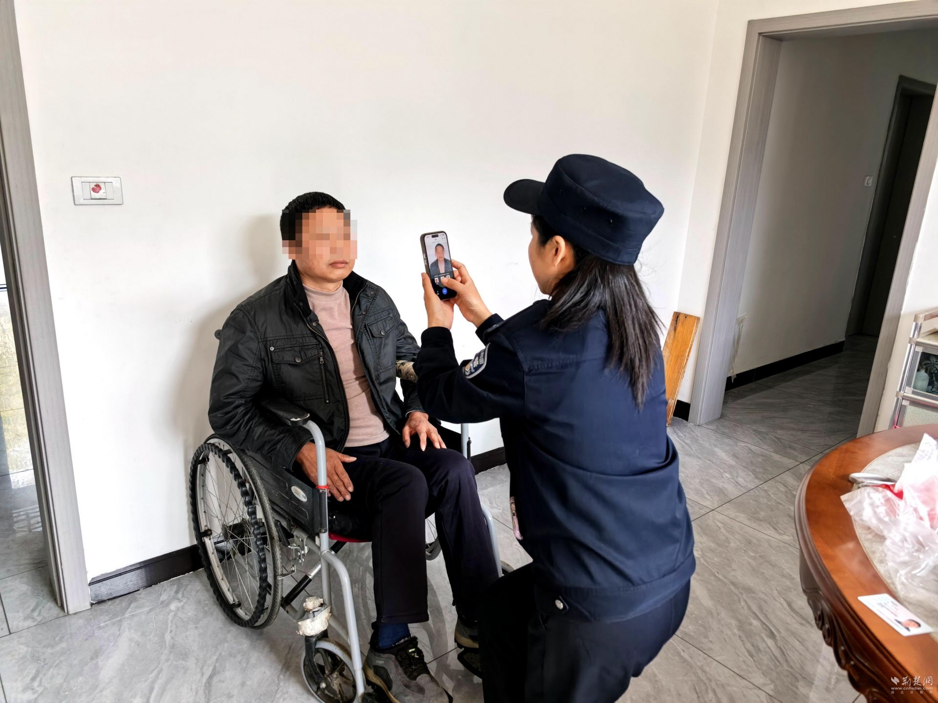 当日上午,该所民警在入户走访过程中,接村干部反映:辖区村民钟先生长期患病,日常依赖轮椅出行,其身份证已到期需紧急换领,却因行动受限无法前往窗口办理。获悉情况后,派出所迅速启动便民服务绿色通道,安排户籍民警携带办证设备赶赴钟先生家中。
