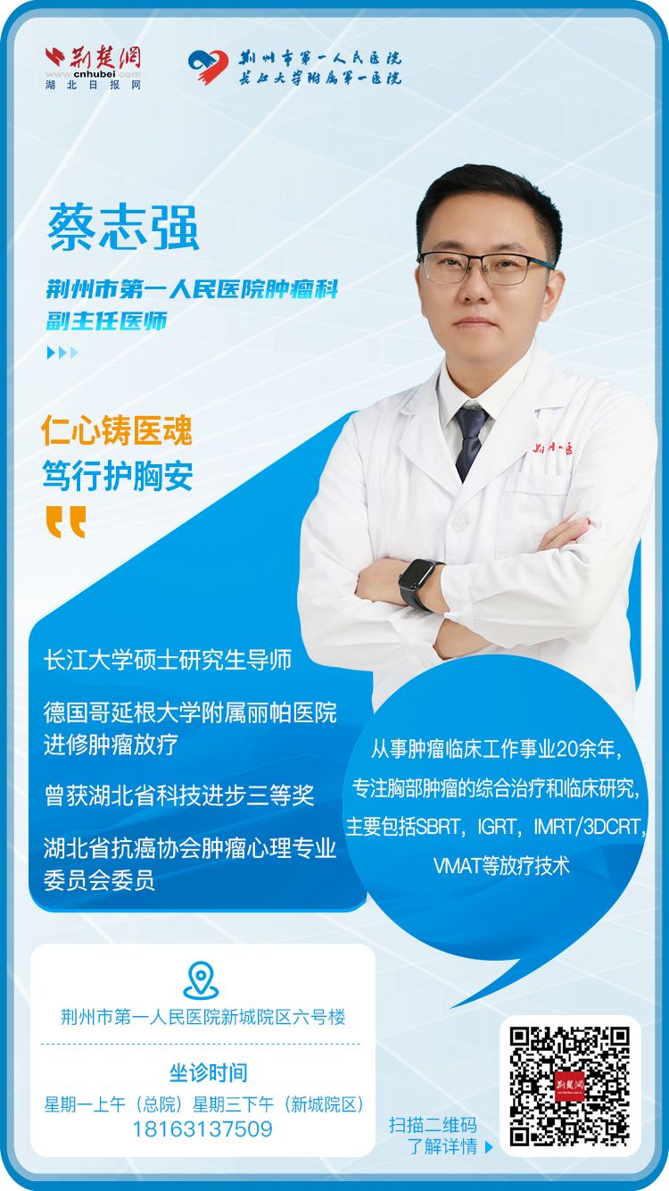 蔡志强:胸部肿瘤二病区肿瘤科副主任,副主任医师,长江大学硕士研究生导师,曾获湖北省科技进步三等奖,湖北省抗癌协会肿瘤心理专业委员会委员,湖北省抗癌协会肿瘤分子靶向治疗专业委员会委员,湖北省临床临床肿瘤学会肺癌专家委员会青委会常委。