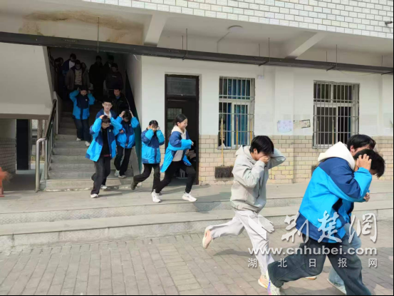随后,应急疏散演练正式启动。随着警报响起,各班师生迅速响应,在消防员与班主任引导下,用湿毛巾捂住口鼻、弯腰低姿,沿预定路线快速有序撤离至操场安全区域,全程紧张规范、高效顺畅。
