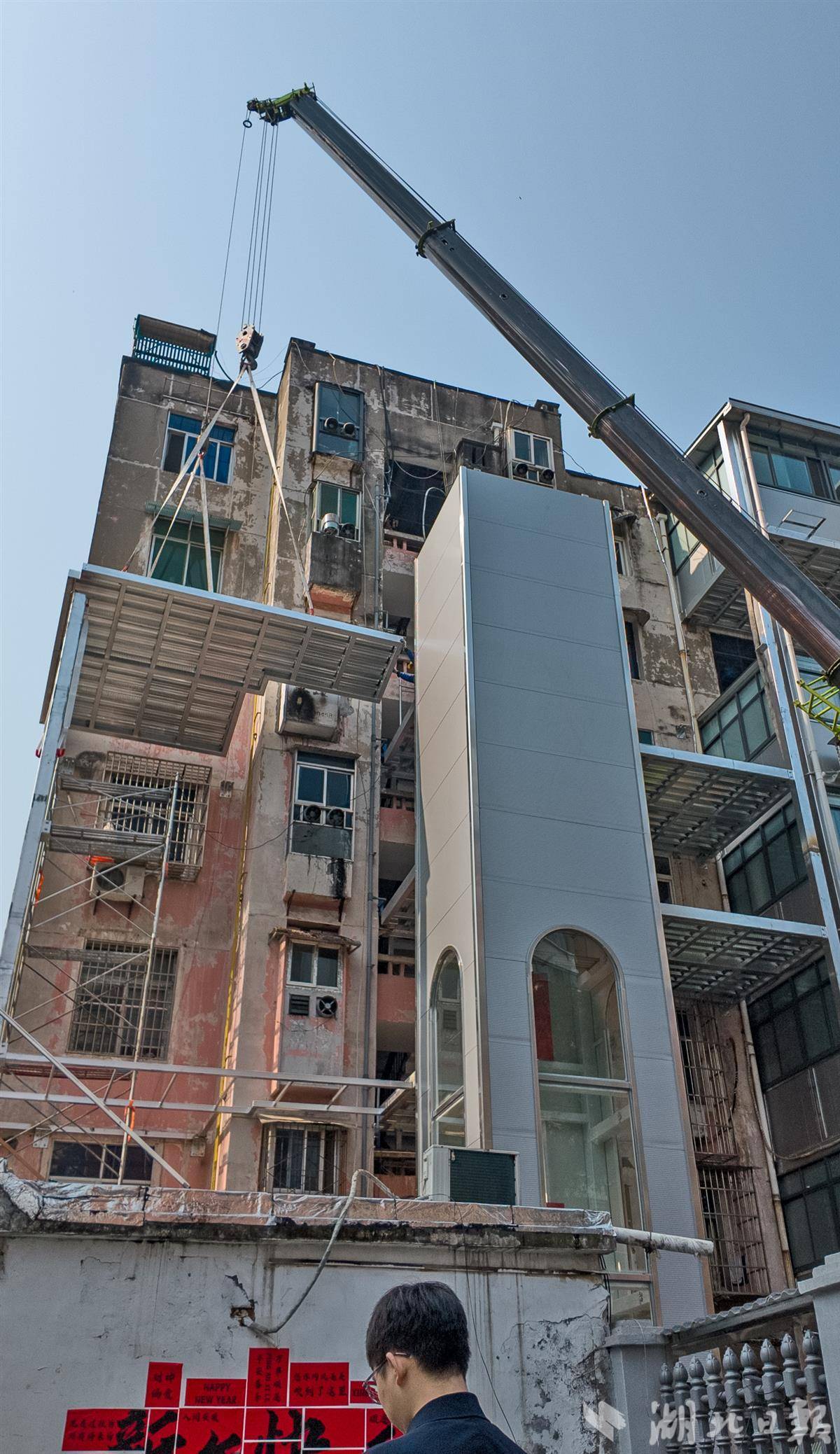 3月13日,走进宜昌樵湖二路老旧居民楼,加装电梯施工现场一派繁忙,随着一部部电梯陆续落地,越来越多 “悬空老人” 实现 “一键直达” 的安居心愿。