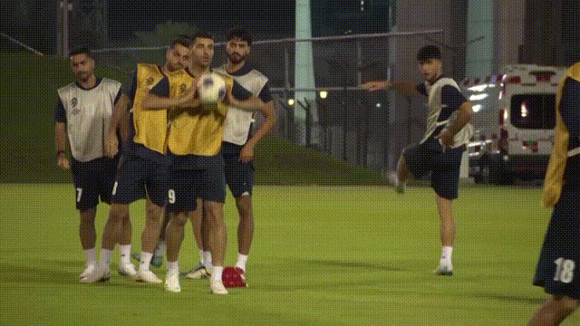 伊朗国家足球队前锋迈赫迪·塔雷米(9号球衣)与队友进行传接球训练。