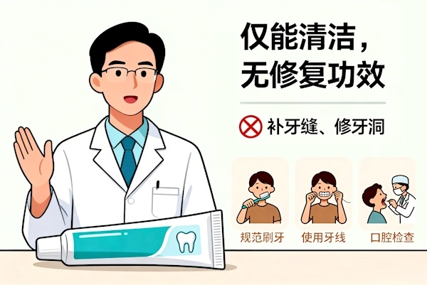 他解释,正规牙膏属于日化用品,核心成分为摩擦剂、清洁剂、起泡剂等,作用仅限于清洁牙齿表面的牙菌斑和食物残渣,并不含修复牙体硬组织、再生牙龈、让牙齿重新靠拢的成分。“牙膏只能清洁,不能治疗,更无法让缺损的牙齿自行长好。”