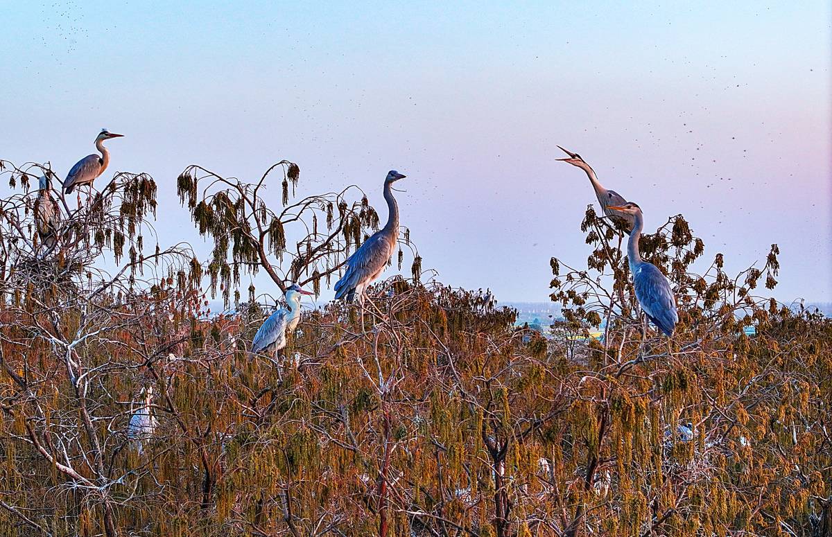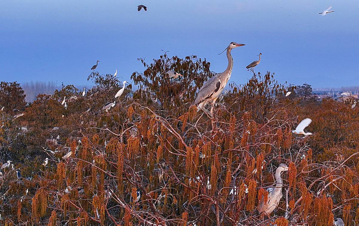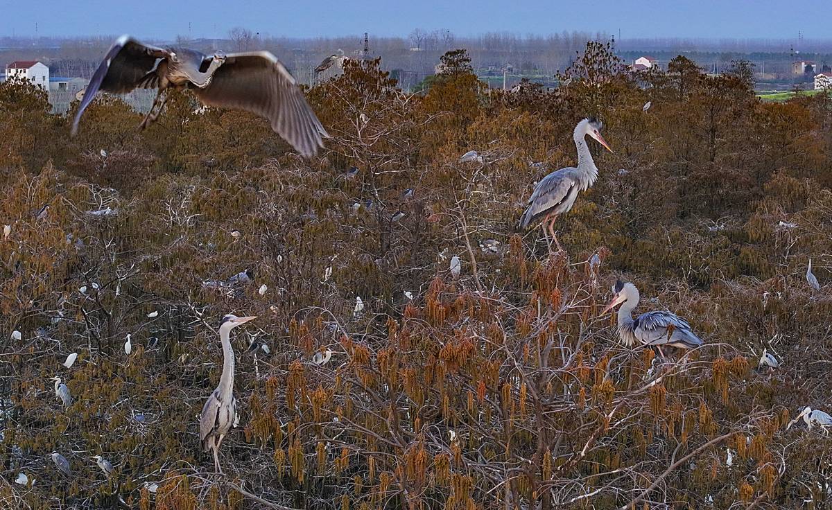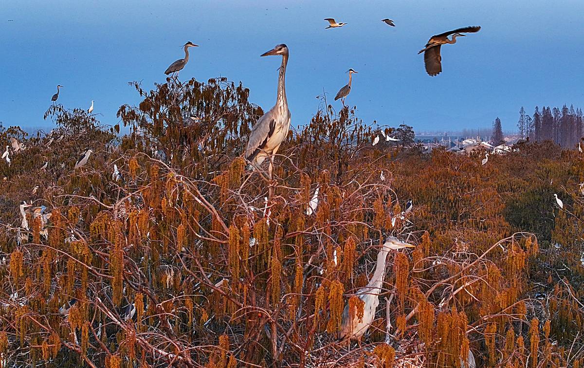 3月13日,许多鹭类安然地在涨渡湖湿地自然保护区的水上森林树枝上筑巢。