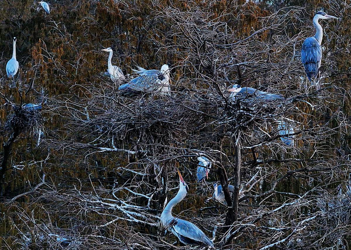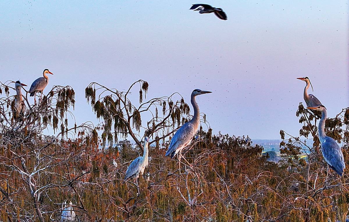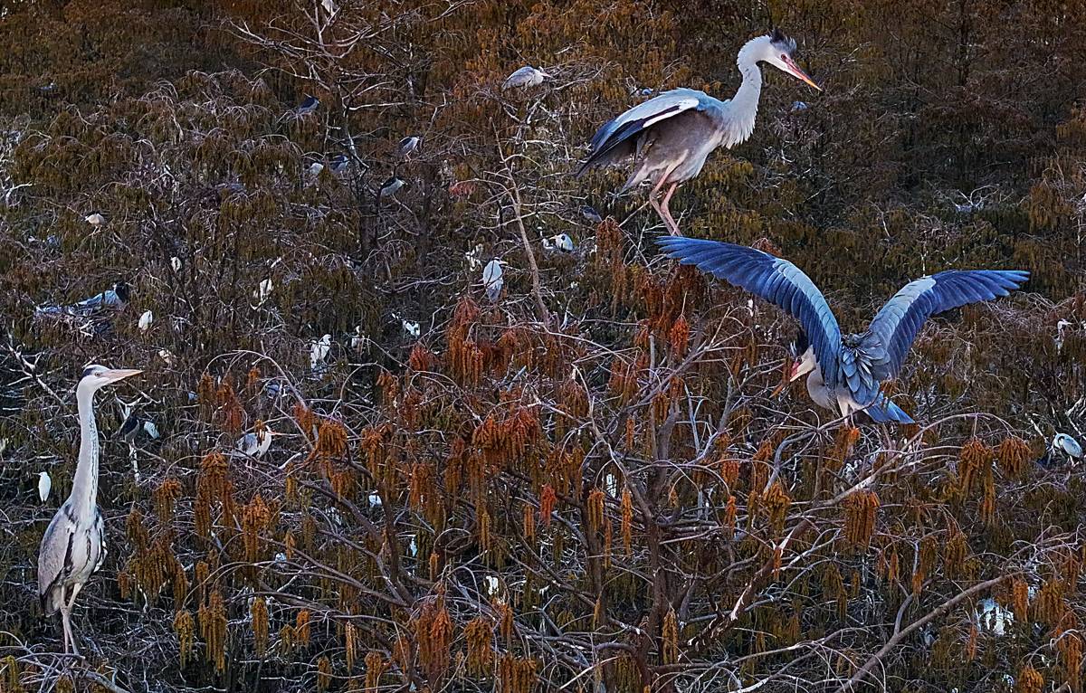 3月13日,许多鹭类安然地在涨渡湖湿地自然保护区的水上森林树枝上筑巢。