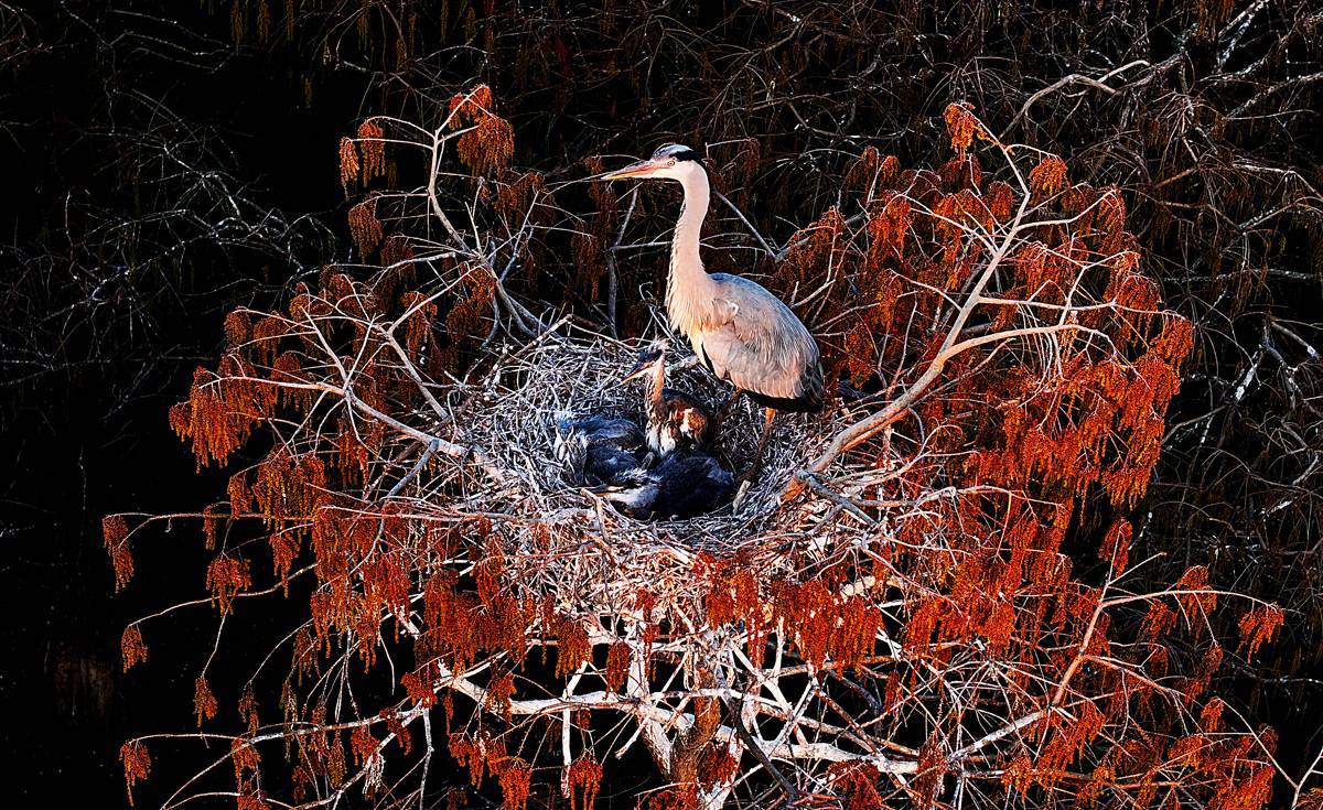 3月13日,涨渡湖湿地自然保护区的水上森林树枝上,刚刚出生不好久的苍鹭。