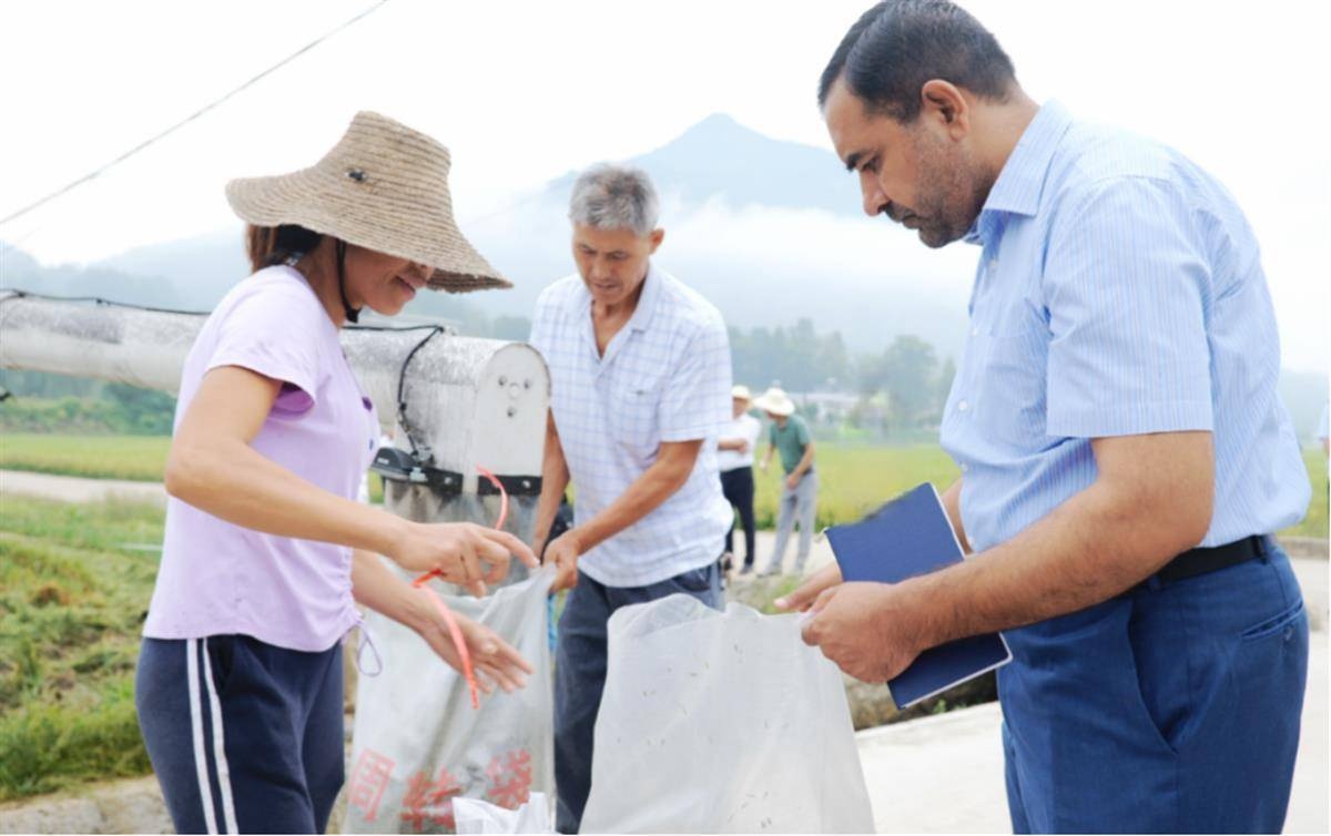 2023年9月19日,巴基斯坦旁遮普大学穆罕默德·阿西法克教授在罗田县观摩红莲型杂交水稻制种田现场测产工作。