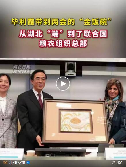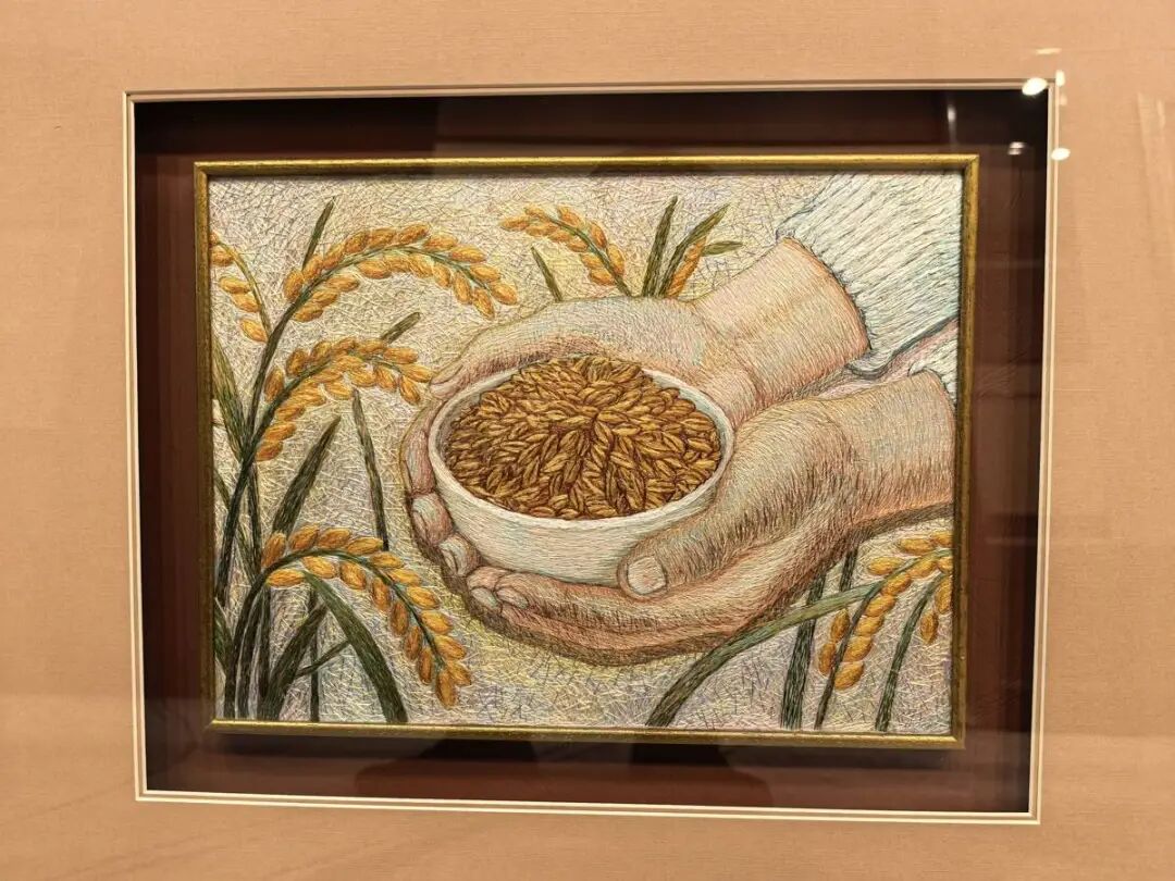 今年全国两会期间,满怀丰收喜悦的全国人大代表、监利市精华水稻种植专业合作社理事长毕利霞,将这幅绣着金黄稻穗和金饭碗的汉绣作品带到了人民大会堂。