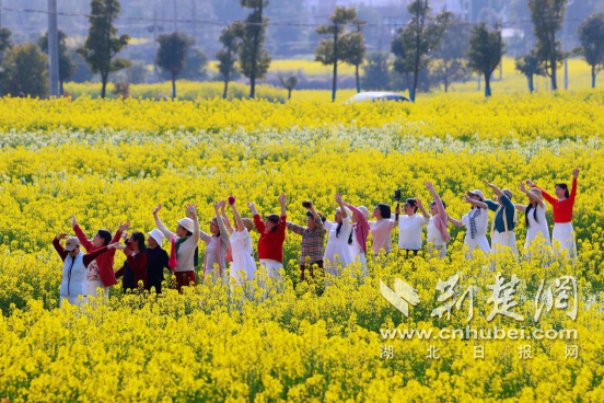 游客们在油菜花中起舞。安从斌 摄