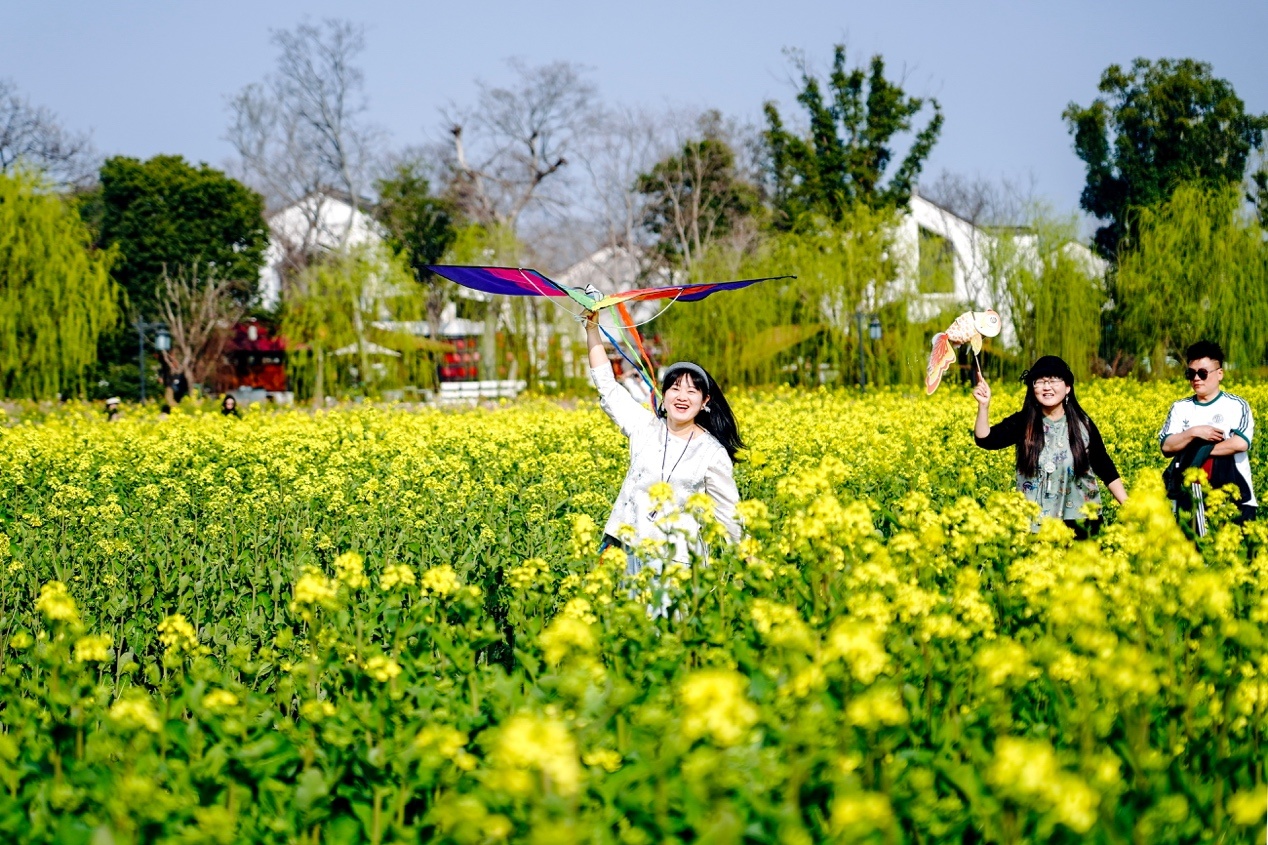 ▲上图:3月14日,游客在浙江省湖州市吴兴区八里店镇潞村油菜花海里放飞风筝,享受春日里快乐时光。(潘学康/人民视觉)