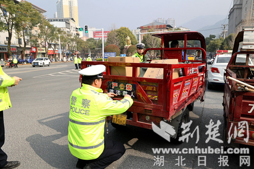 结合春耕生产期间农用车、三轮车出行特点,交警在三轮摩托车、电动三轮车等醒目位置统一张贴“严禁违法载人”警示车贴,让车辆成为流动的交通安全宣传载体,实现执法整治与宣传教育同步推进。同时,充分利用电视、“村村通”大喇叭、手机短信、LED显示屏等宣传平台,广泛宣传不文明交通违法行为的危害性,赢得广大市民的支持与理解,营造良好的交通安全宣传氛围。