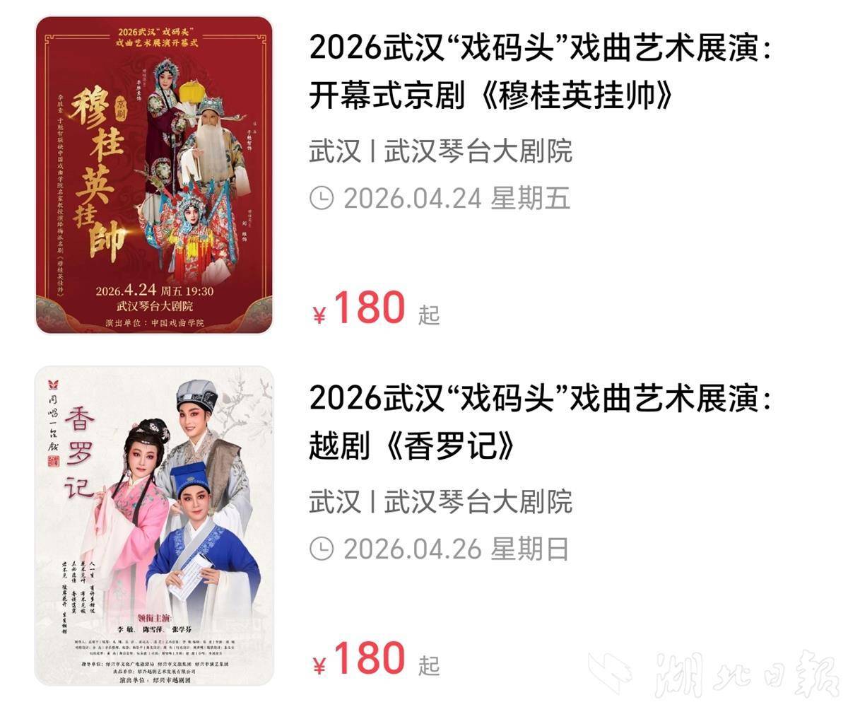 湖北日报讯(记者农新瑜、通讯员周媛媛)从武汉琴台大剧院获悉,将于下月拉开帷幕的2026武汉“戏码头”戏曲艺术展演,已于3月15日全面对外开票。秉承文化惠民宗旨,所有演出均设置早鸟优惠及低价学生票,让更多市民走进“戏码头”,共享国粹盛宴。