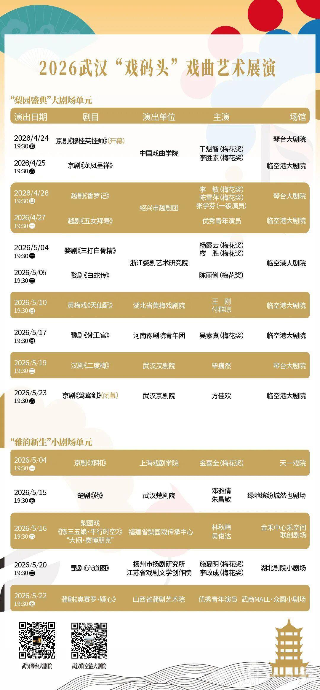 根据总体安排,本次展演推出“梨园盛典”大剧场、“雅韵新生”小剧场和“赏心乐戏”惠民活动三大板块。其中,“梨园盛典”大剧场单元将带来10场高规格演出,汇聚京剧、汉剧、豫剧、越剧、黄梅戏、婺剧等龙头院团与领军人物。4月24日,由京剧名家于魁智、李胜素领衔的开幕大戏《穆桂英挂帅》将在琴台大剧院上演。此后,绍兴市越剧团李敏、陈雪萍将带来越剧《香罗记》,浙江婺剧艺术研究院杨霞云、楼胜、陈丽俐演绎《三打白骨精》,河南豫剧院青年团吴素真主演豫剧《梵王宫》,还有黄梅戏《天仙配》、汉剧《二度梅》等经典剧目轮番登台。5月23日,闭幕演出将在临空港大剧院上演,由武汉京剧院为牡丹花奖得主方佳欢量身定制的新作《鸳鸯剑》压轴登场。