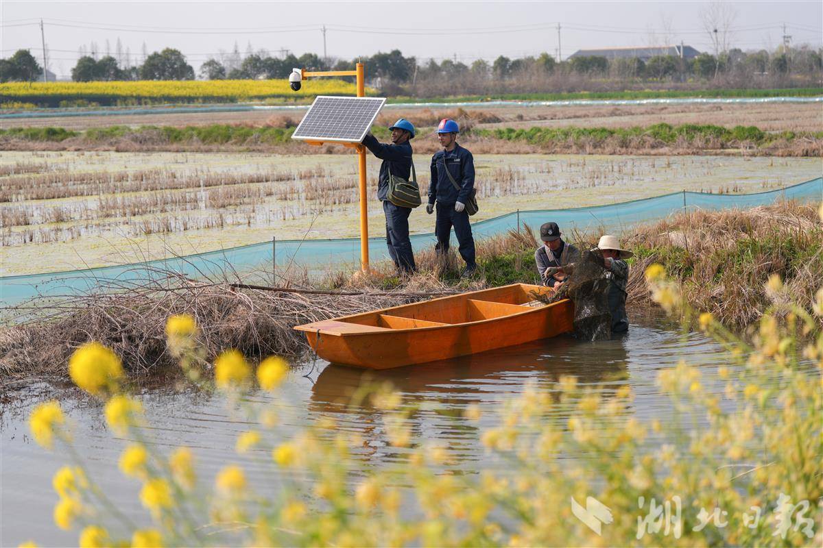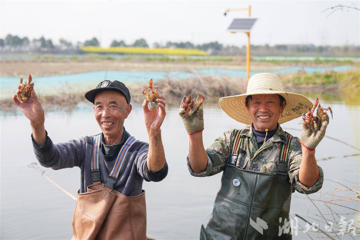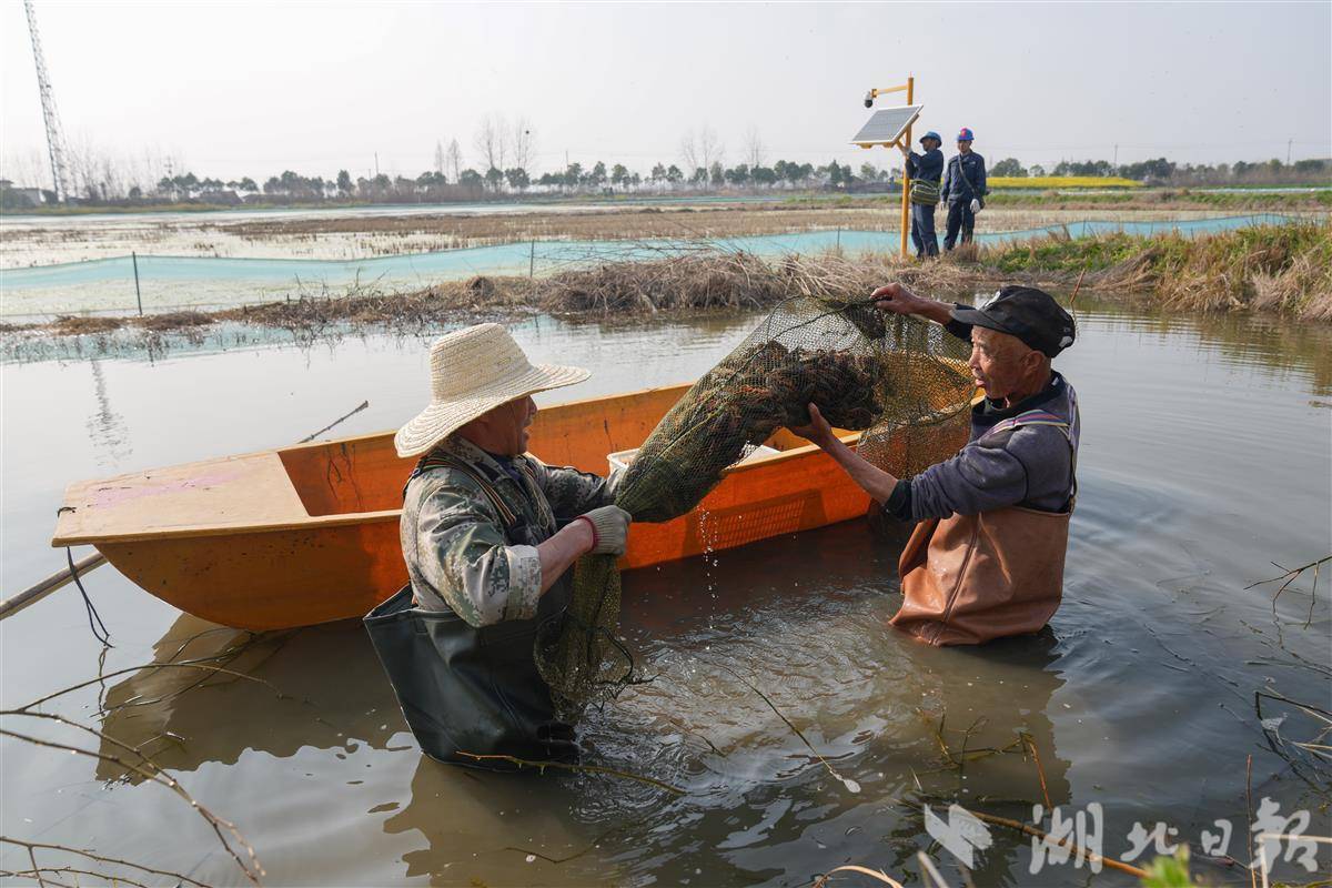 3月12日,在潜江市龙湾镇郑家湖村四季有虾养殖基地,村民们正在捕捞新上市的龙虾。供电员工巡检附近的太阳能智慧监测仪,该设备可精准控制增氧与投喂,有效预防因缺氧、中毒等导致的小龙虾死亡,为四季养虾提供科技助力。潜江是“中国小龙虾之乡”,潜江龙虾综合产值已突破900亿元。(视界网 覃涛 祝科 摄)
