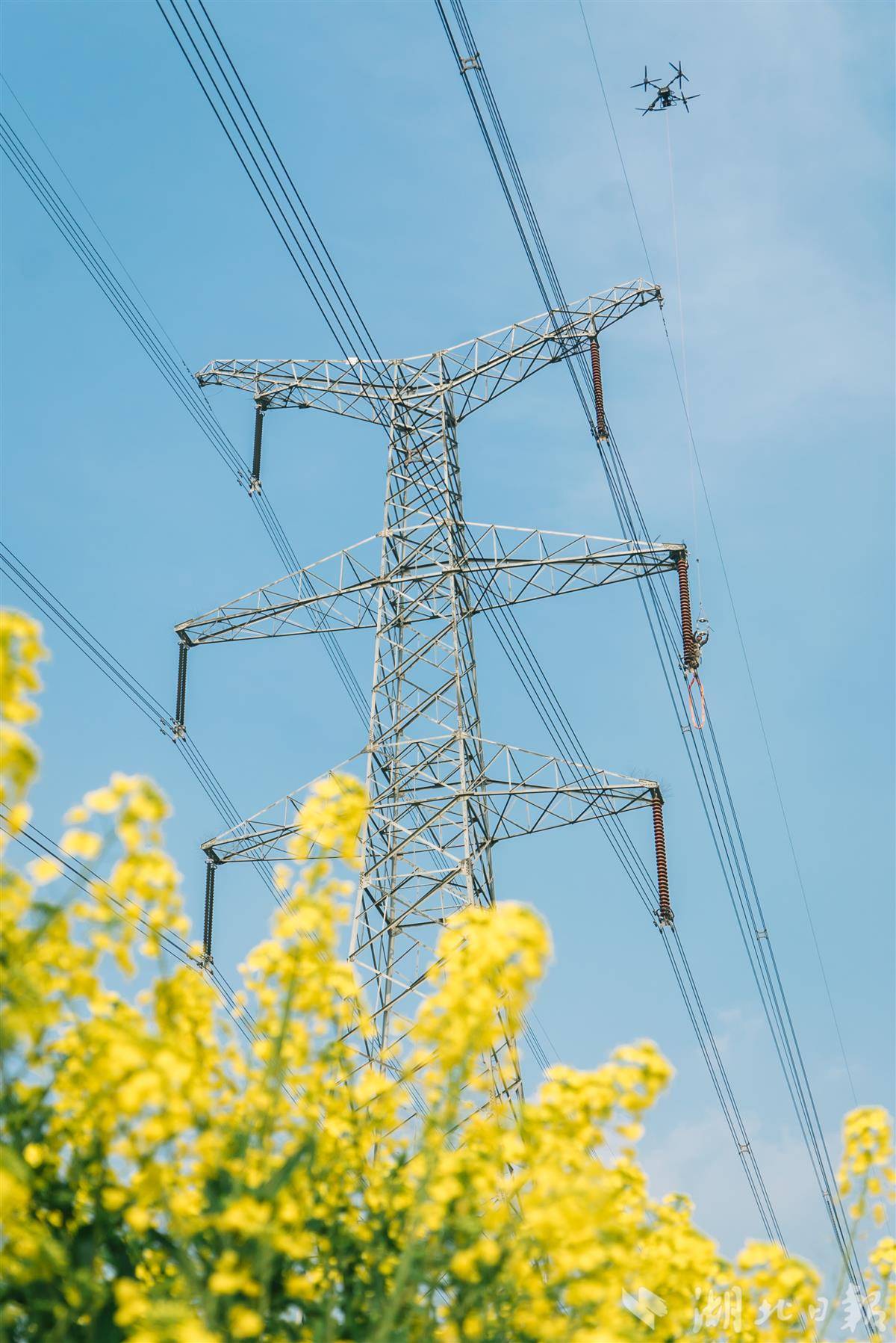 3月12日,在潜江市浩口镇,电力工人在500千伏江桃线168号铁塔上更换绝缘子,保障电力大动脉安全稳定运行。湖北经历了两轮雨雪冰冻天气,电力工人赶在春季时节,全面排查电力设备,保证夏季用电高峰安全稳定供电。(视界网 孔韬 欧阳雷 樊成浩 摄)