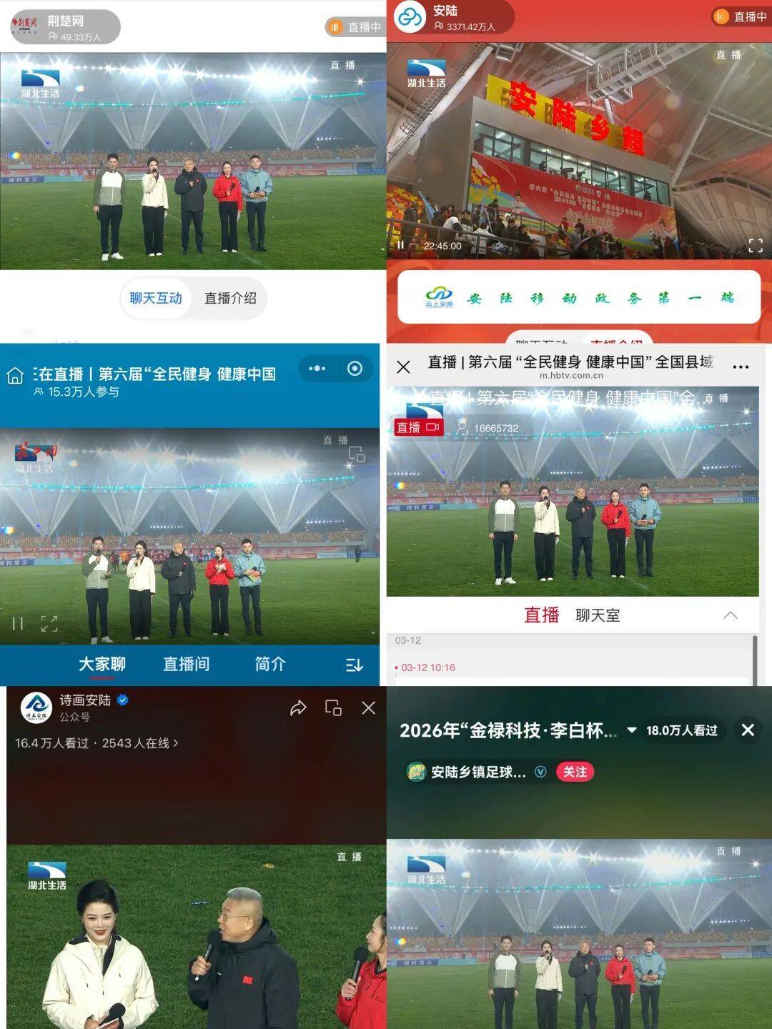 此次开幕式在湖北生活、长江云 、荆楚网、经视直播、武汉发布、咪咕视频、诗画安陆、安陆乡镇足球联赛等十余个平台同步直播,同时在太白广场、东大时代广场、体育中心外围设置观赛大屏免费供市民观看。开幕式当天,新落成的安陆市体育中心美轮美奂、座无虚席,超6000名球迷现场观赛,5176万人在线上观看直播,全网点击量超2亿。