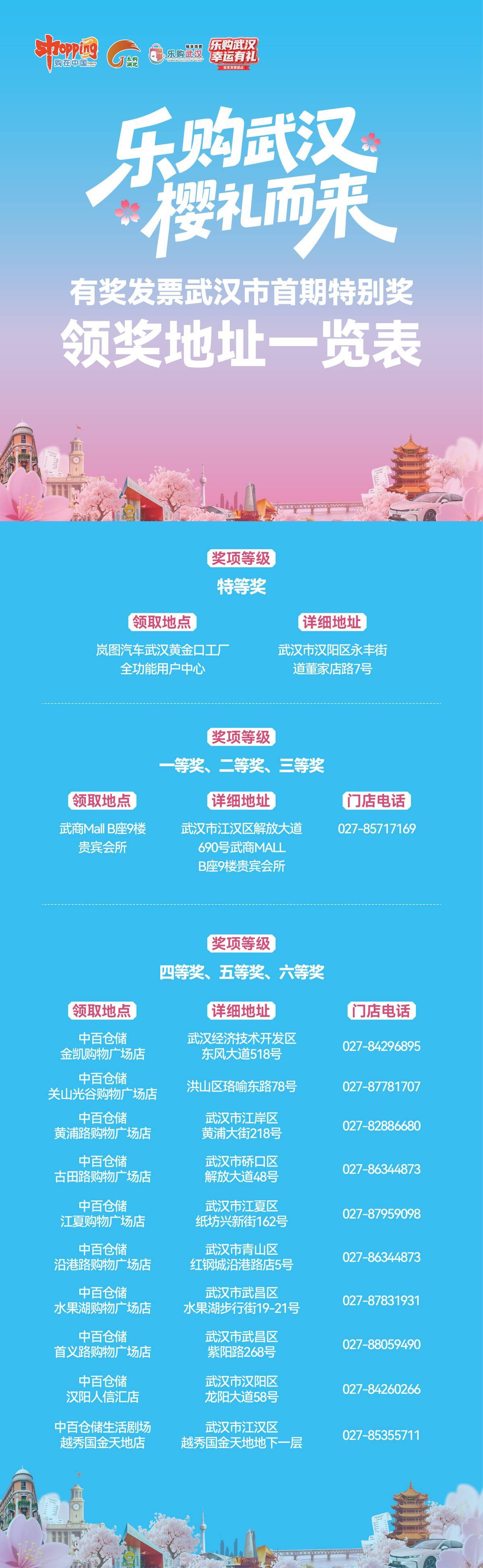 四、五等奖:可在武汉全市10家中百仓储超市门店中任选一家办理,覆盖江岸、江汉、硚口、汉阳、武昌、洪山、青山、江夏、经开等区域,具体门店包括: