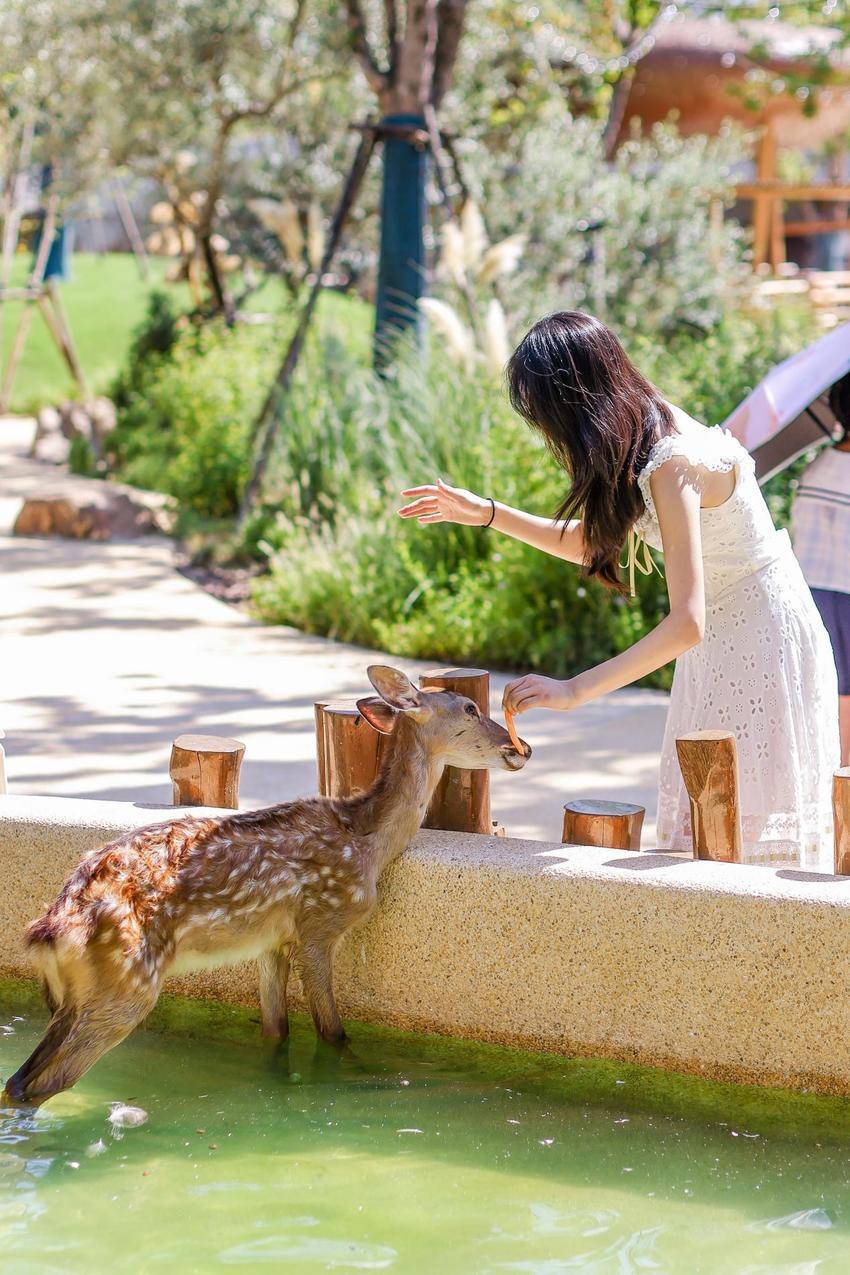 麓客岛上游客与梅花鹿互动