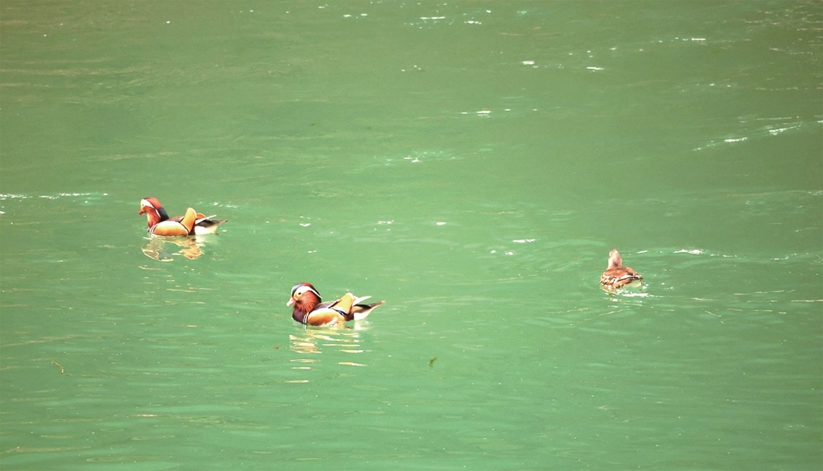 当日,墨池管理站站长袁孝文在竹山县柳林乡公祖河巡护时,于河面邂逅这一惊喜场景。数十只鸳鸯结伴游弋,将宁静的水面点缀得生机盎然:雄鸟头顶翠绿、喙部橙红,在阳光下熠熠生辉;雌鸟素雅温润,雌雄两两相伴,步调一致。它们时而并排悠游,时而潜入水底觅食,又忽而追逐嬉戏,动作轻盈灵动,构成一幅绝美的生态画卷。