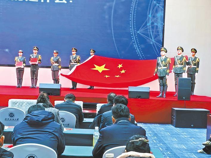 “请天安门国旗入场!”武汉纺织大学举行国旗迎请仪式。在嘹亮的国歌声中,该校党委书记徐卫林院士健步上台,庄严迎旗。国旗护卫队员全幅展示国旗。一并展示的还有该校研发的嫦娥五号、嫦娥六号月面国旗。