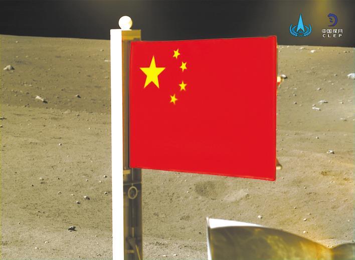 2020年12月4日,国家航天局公布了嫦娥五号探测器在月球表面进行国旗展示的照片。(资料图片,新华社发)