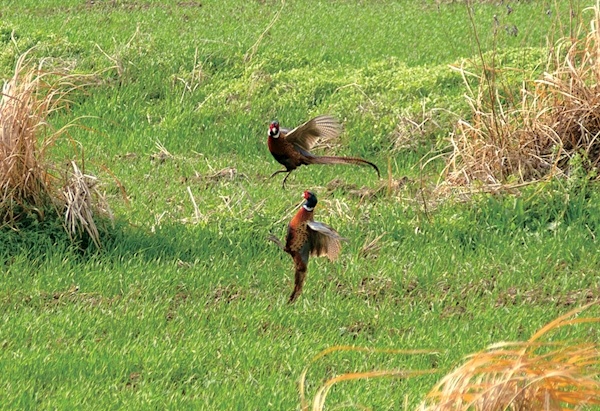 本报讯 3月13日,在郧阳区安阳镇陈营村的麦田里,两只雄性环颈雉在田间嬉戏追逐,为春日田野增添了勃勃生机与自然野趣。