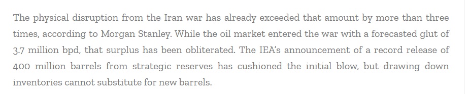 文章援引摩根士丹利的数据称,美国和以色列对伊朗发动的军事打击造成的实际供应中断规模已是这一数字的三倍多。尽管石油市场在战前预计每日供应过剩370万桶,但这部分过剩产能已被抹去。国际能源署宣布从战略储备中创纪录地释放4亿桶石油,这缓解了对市场的最初的冲击,但消耗库存无法替代新增供应。