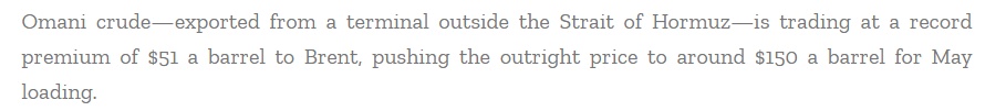 文章注意到,原油现货市场正发出压力信号。从霍尔木兹海峡以外的港口出口的阿曼原油价格较布伦特原油价格出现每桶51美元的创纪录溢价,这将推动5月装船的阿曼原油价格达到每桶150美元左右。