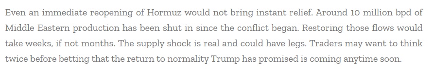文章最后说,即使霍尔木兹海峡立即重新开放,也无法带来高油价的即刻缓解。自军事打击开始以来,中东地区每日约1000万桶的产量已被关闭。恢复这些供应将需要数周,甚至数月的时间。供应冲击是真实存在的,并且可能持续下去。人们如果押注美国政府承诺的恢复正常会很快到来,可能需要三思。
