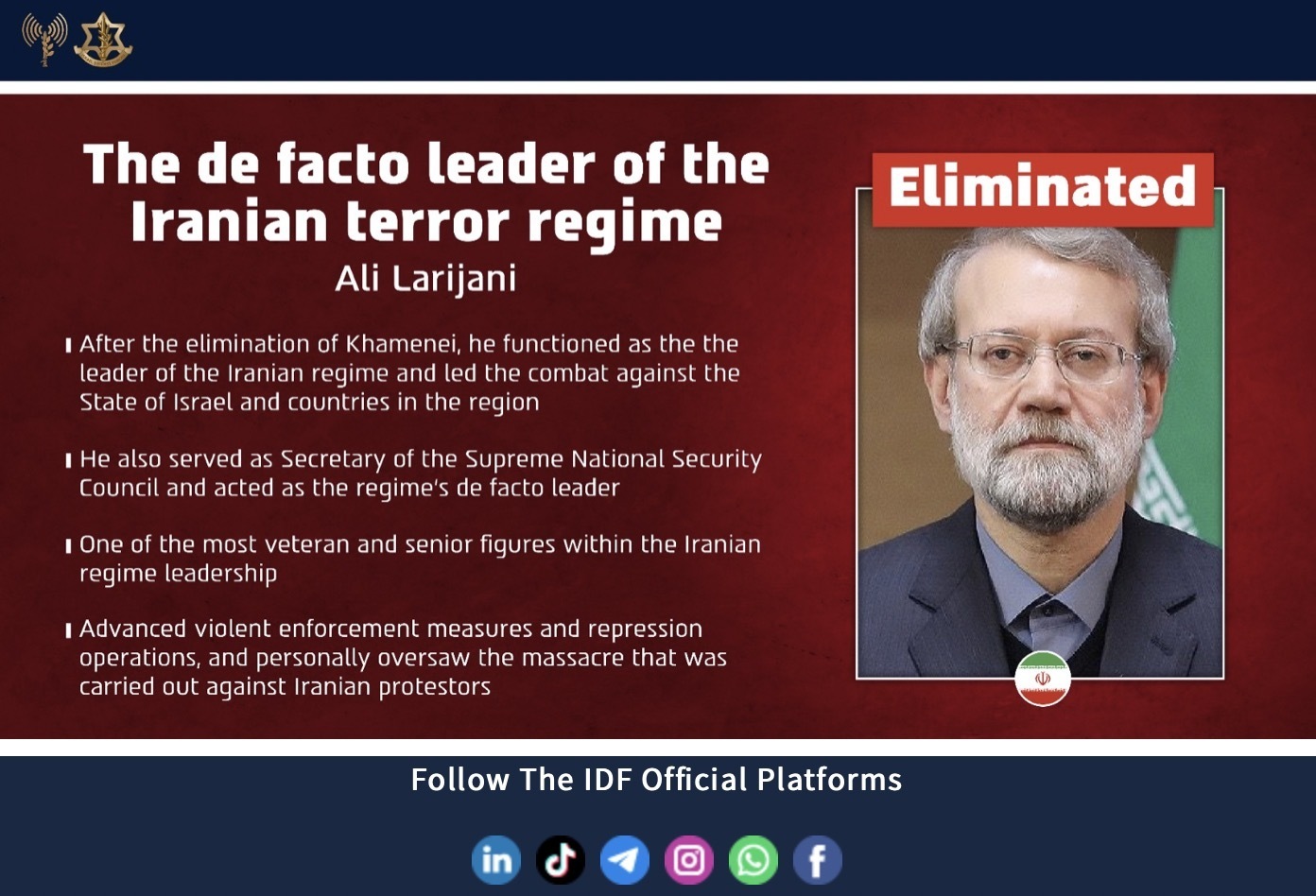 伊朗伊斯兰共和国总统佩泽希齐扬当地时间18日凌晨发表正式声明,沉痛哀悼在近期恐怖袭击中遇难的国家最高安全委员会秘书、前议长阿里·拉里贾尼。17日,以色列国防军发表声明称,当日凌晨,在对伊朗首都德黑兰的空袭行动中,“打死伊朗最高国家安全委员会秘书阿里·拉里贾尼”。