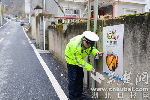 交警在张贴交通安全主题海报。通讯员 供图