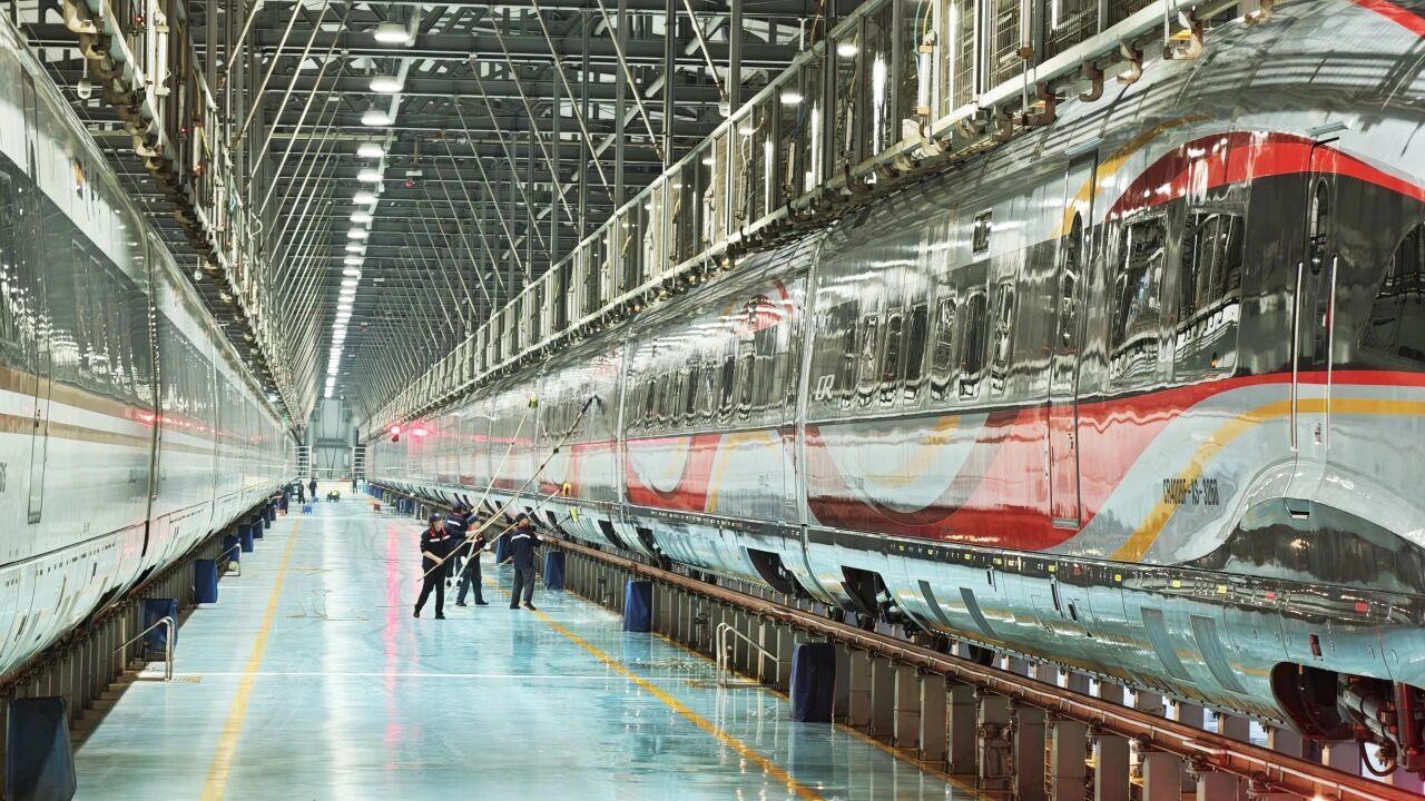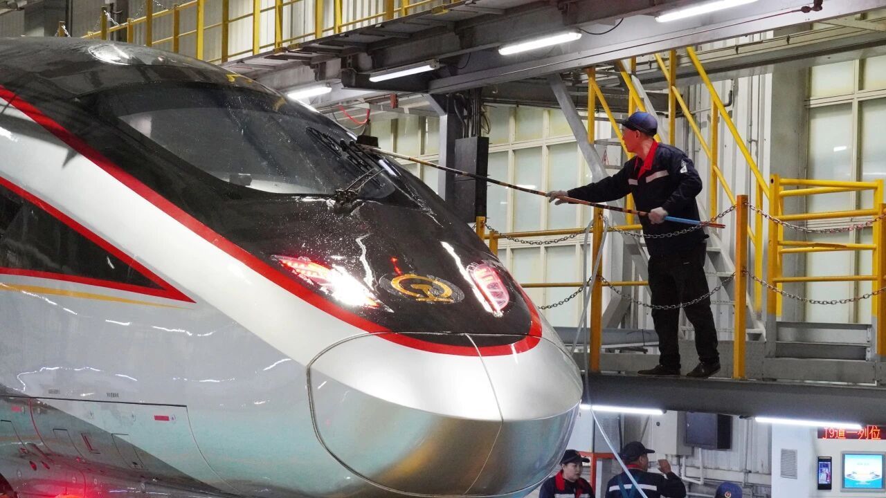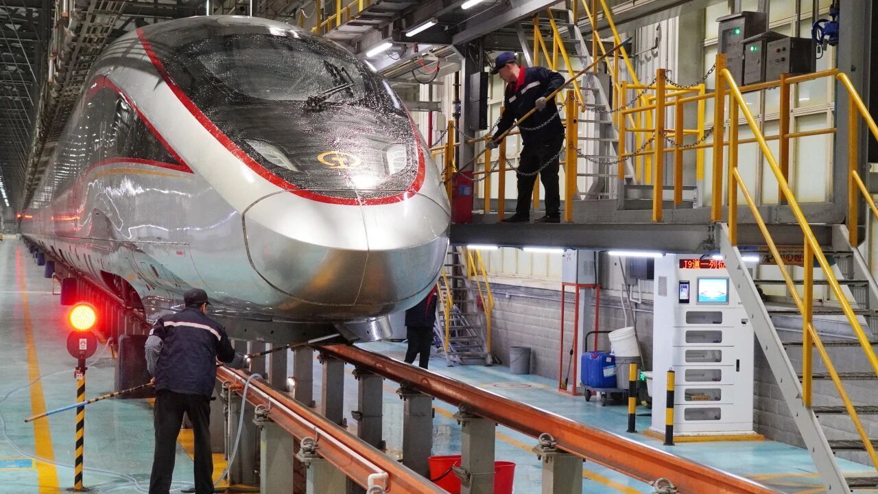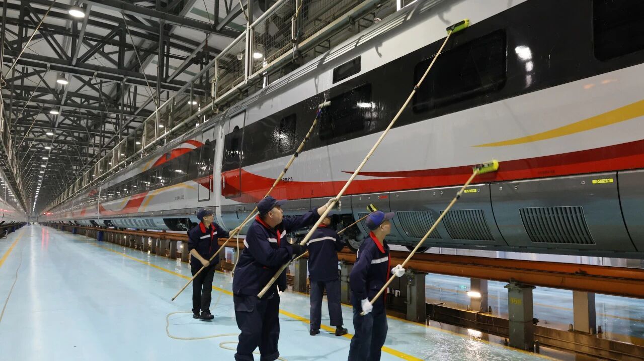 复兴号的帅气车头会进行“精致护理”。作业人员手持软刷与专用布料,沿车头曲面轻柔擦拭,从挡风玻璃到车身涂装,每一处都不遗漏。