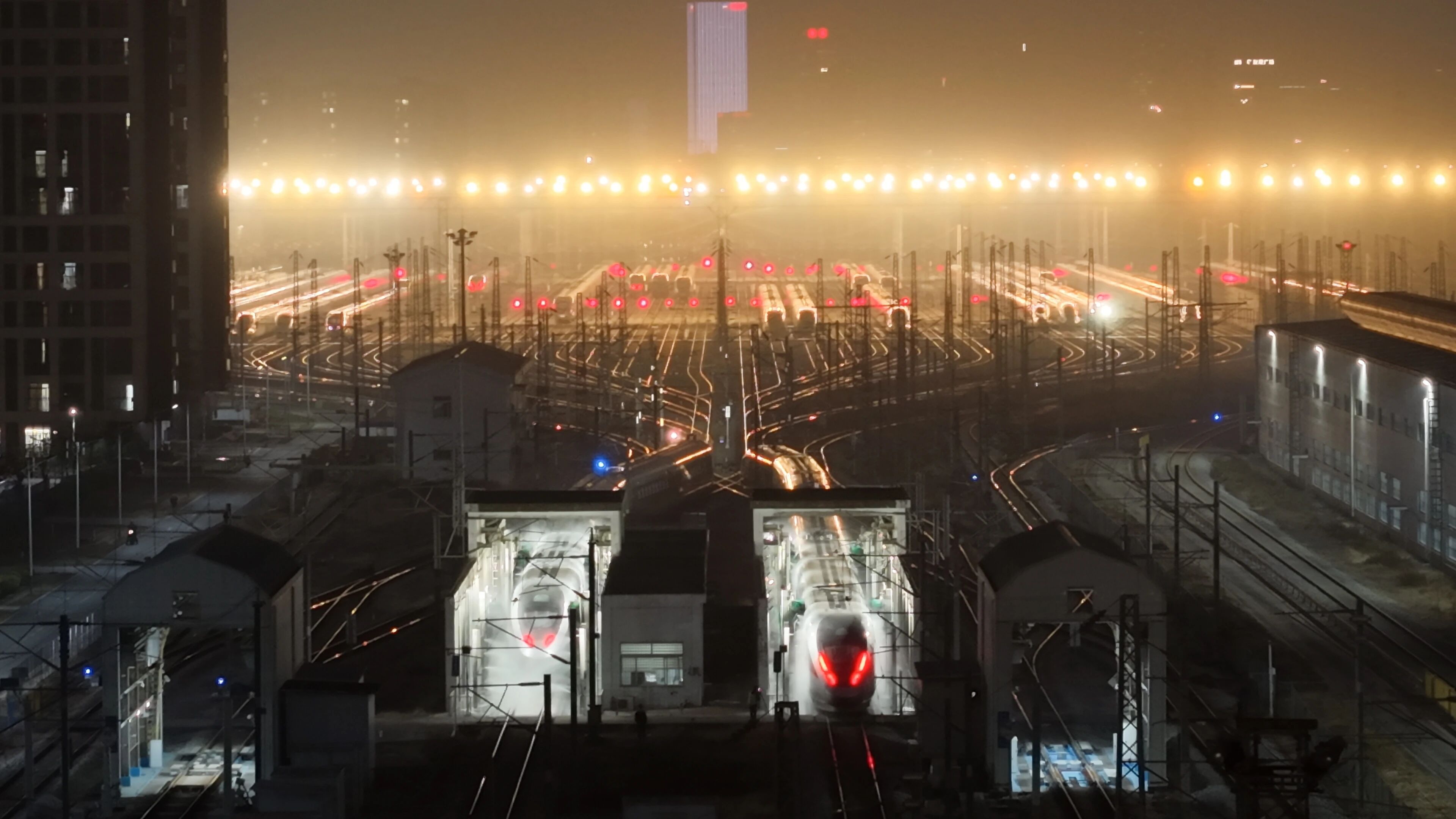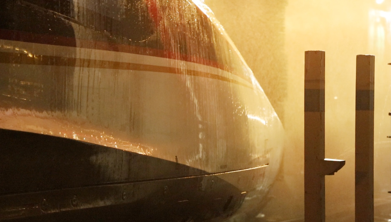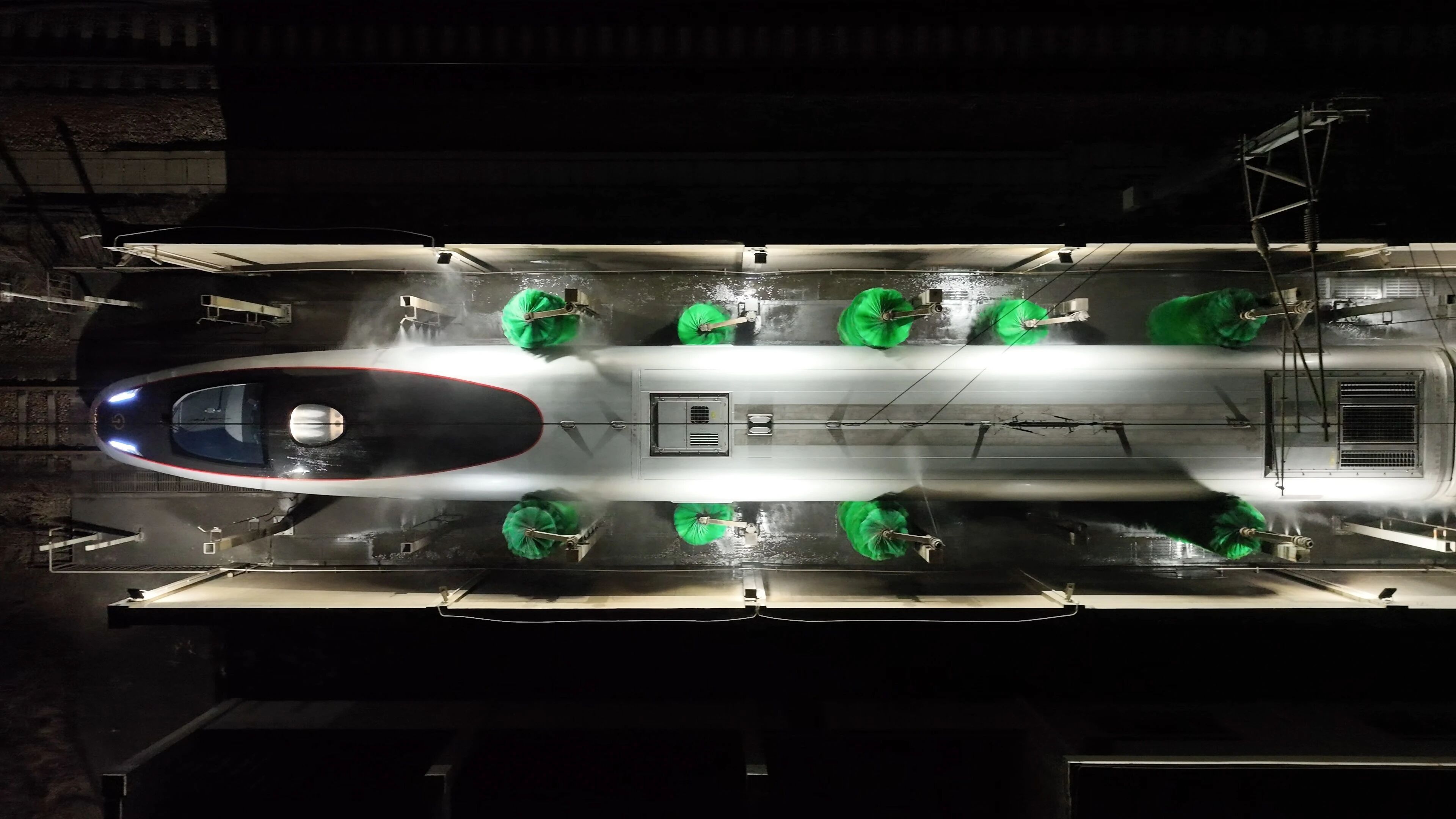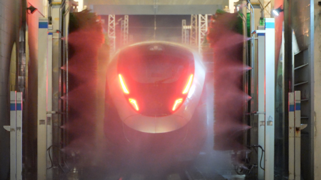 旋转毛刷沿车体轮廓展开作业,对两侧车身、裙板等部位进行全方位清洗。大约5分钟,一列8节编组的复兴号即可完成预冲洗、洗涤剂喷淋、洗涤剂柔洗、回水冲刷、清水冲刷和漂洗等多道工序,重新焕发透亮光泽。