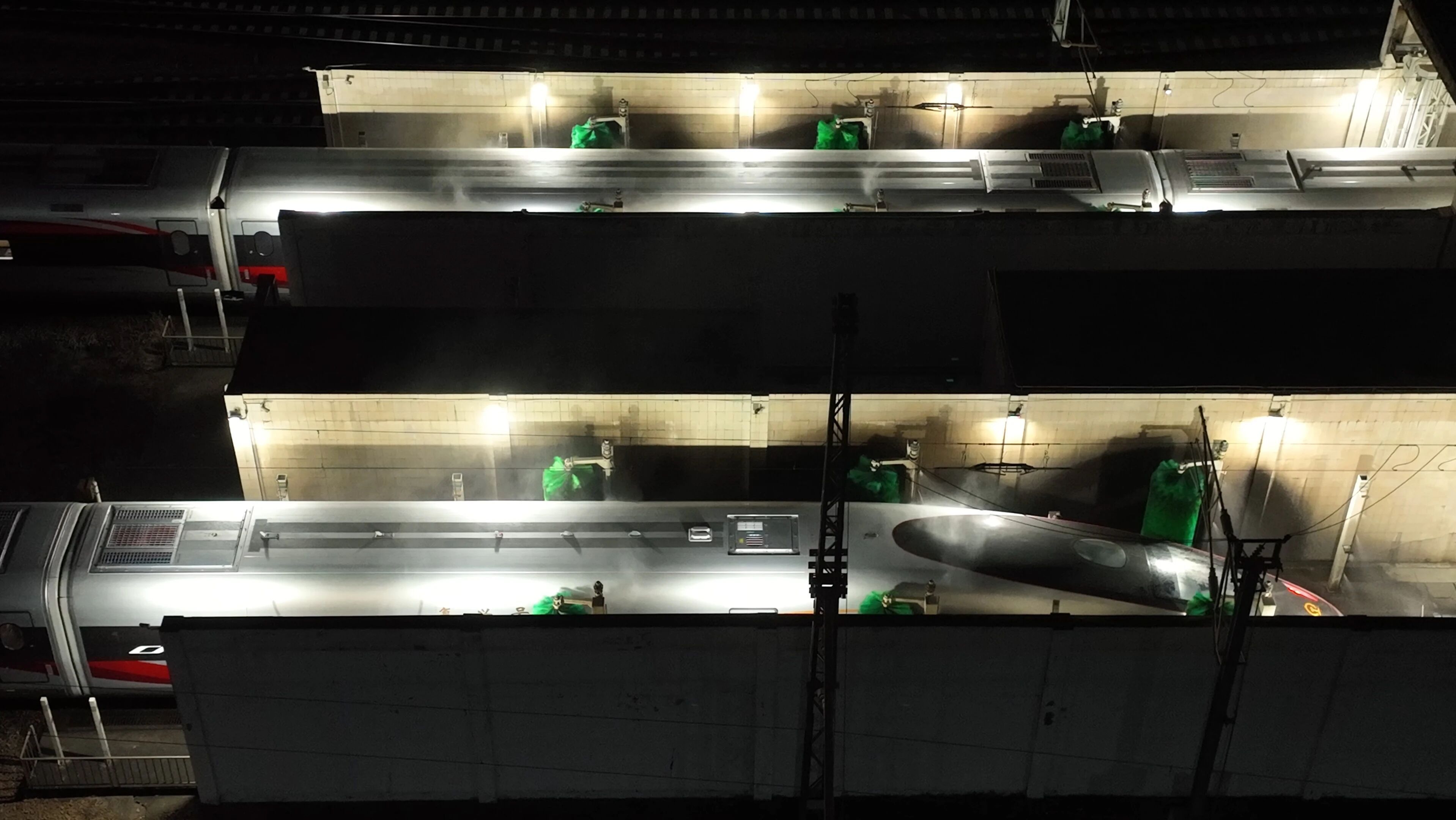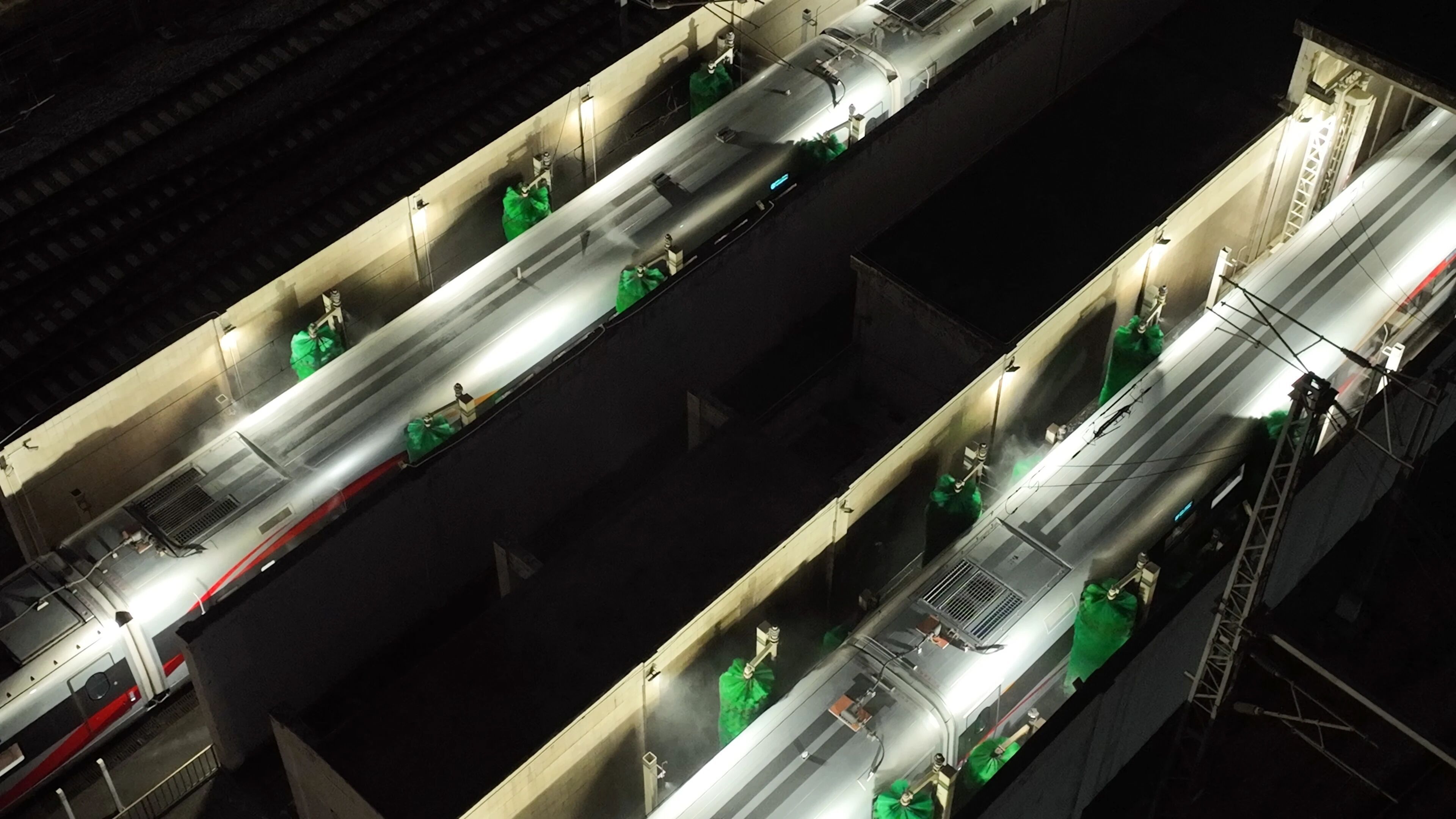 进出检修库的线路上设有全自动列车清洗线,复兴号慢速驶入清洗通道时,机械洗刷、喷淋等系统立即启动,细密的水流配合特制中性清洗剂形成均匀泡沫,轻柔包裹车身。