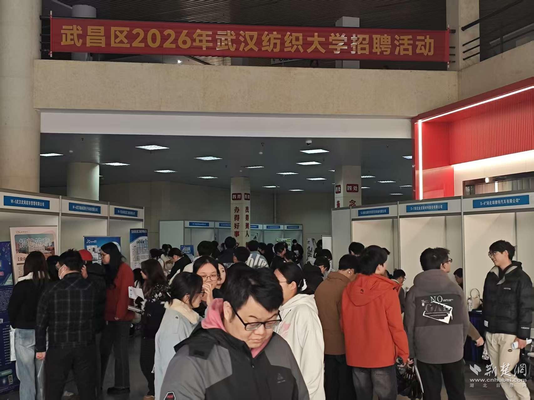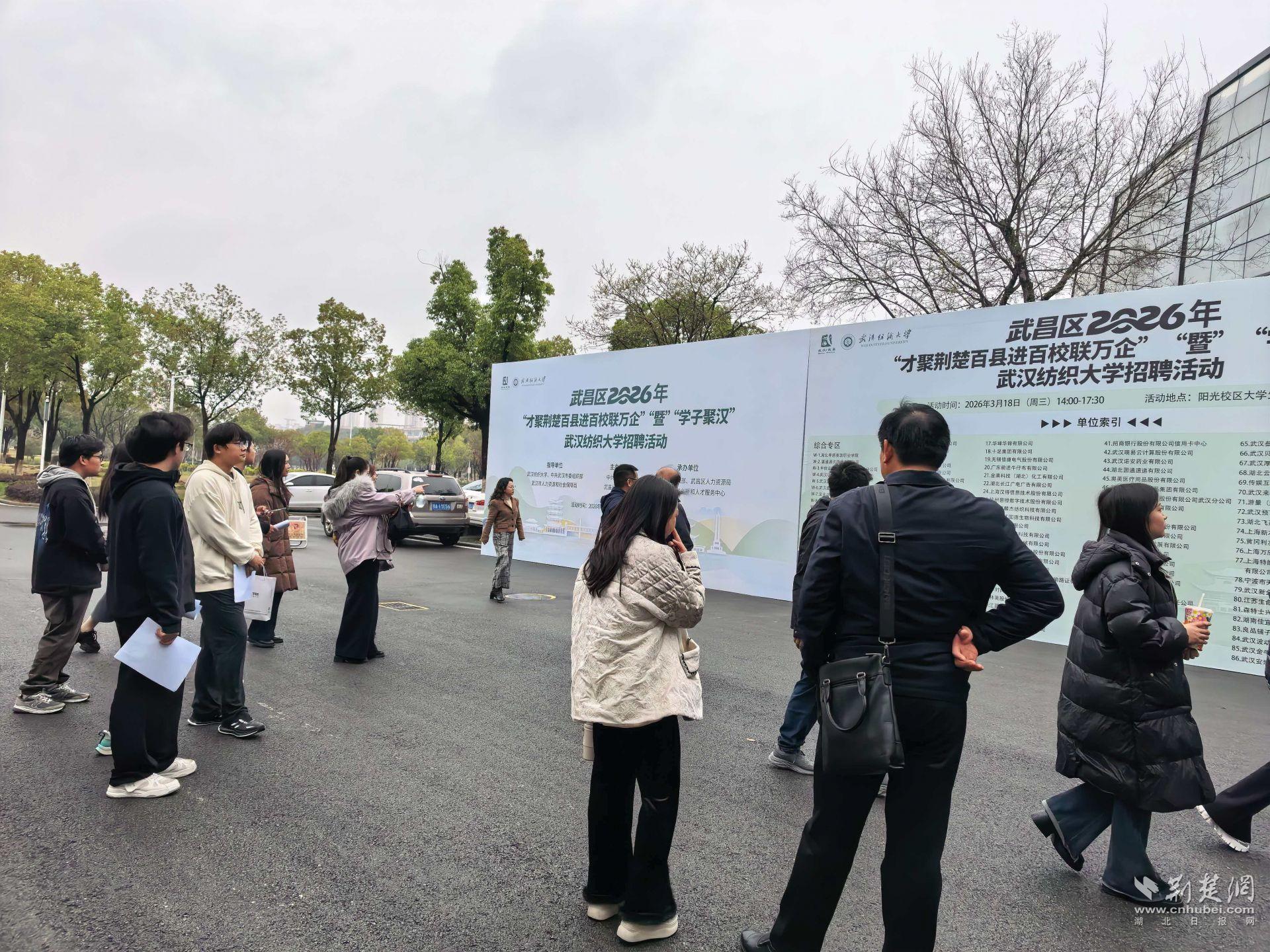 荆楚网(湖北日报网)讯(通讯员 杨劼)春招正当时,引才暖校园。为深入落实湖北省“才聚荆楚百县进百校联万企”暨“学子聚汉”专项行动,深化校企地协同育人成果,3月18日,2026年武昌区春季校园招聘会在武汉纺织大学阳光校区成功举办。本次活动由中共武昌区委、武昌区人民政府主办,武昌区委组织部、武昌区人力资源局、武昌区科技创新和人才服务中心承办,武汉首义人才服务有限责任公司协办,汇集117家优质企业,带来4920个精准适配岗位,为纺大学子搭建起高质量就业对接桥梁。