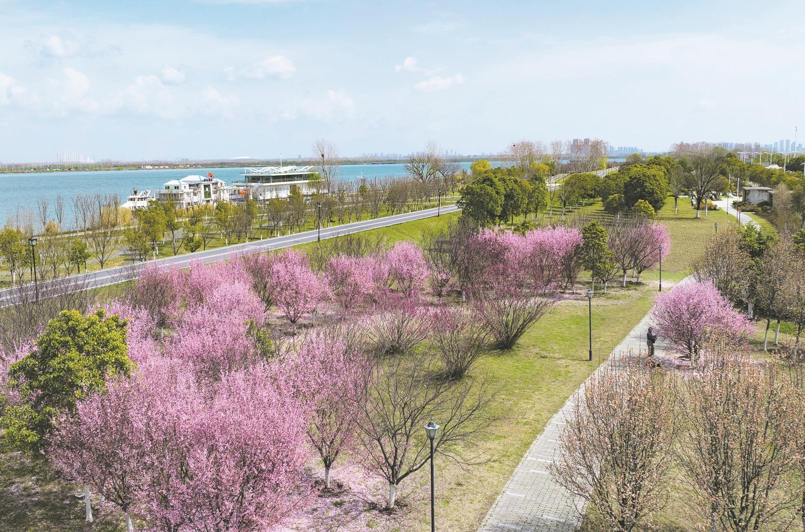 3月18日,襄城区滨江大道东延伸段春意盎然,呈现出一幅水清、岸绿、景美的生态画卷。