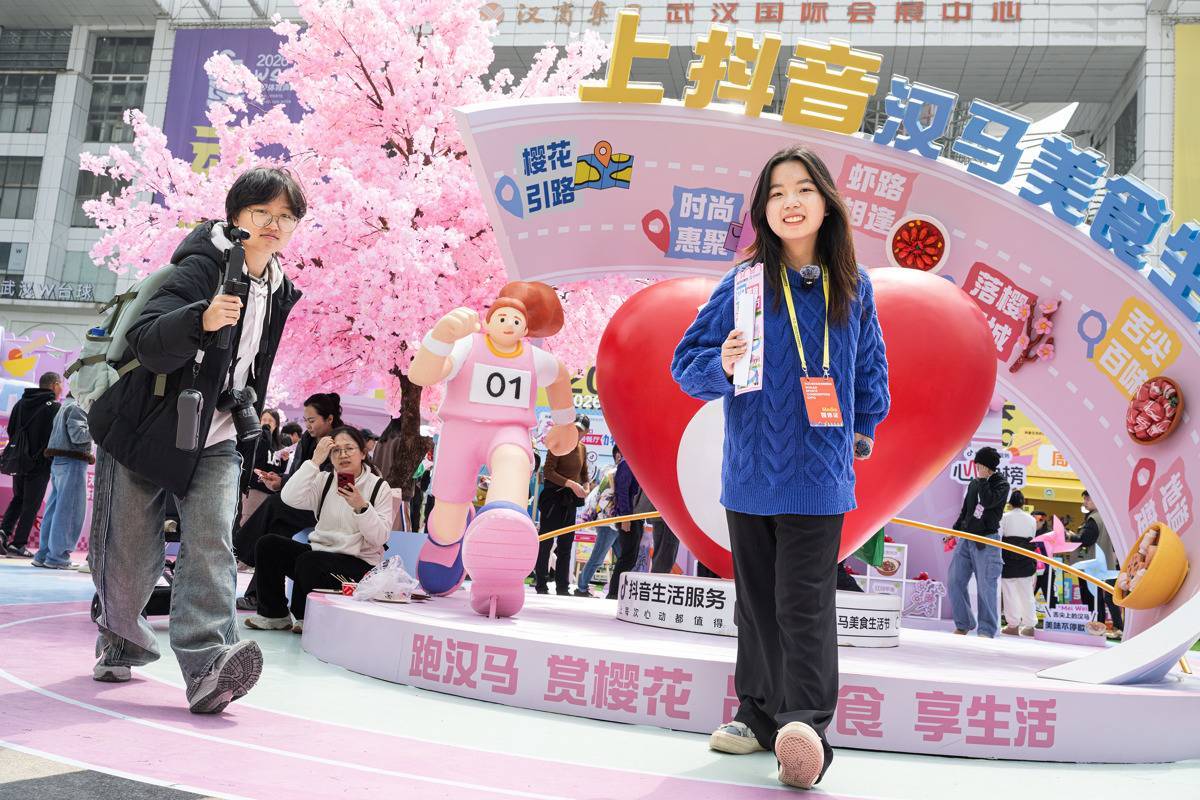 3月19日,2026武汉马拉松开启赛前物资领取通道。在选手物资领取通道出口处,不少跑者提前穿上汉马跑服,拍摄“定妆照”。