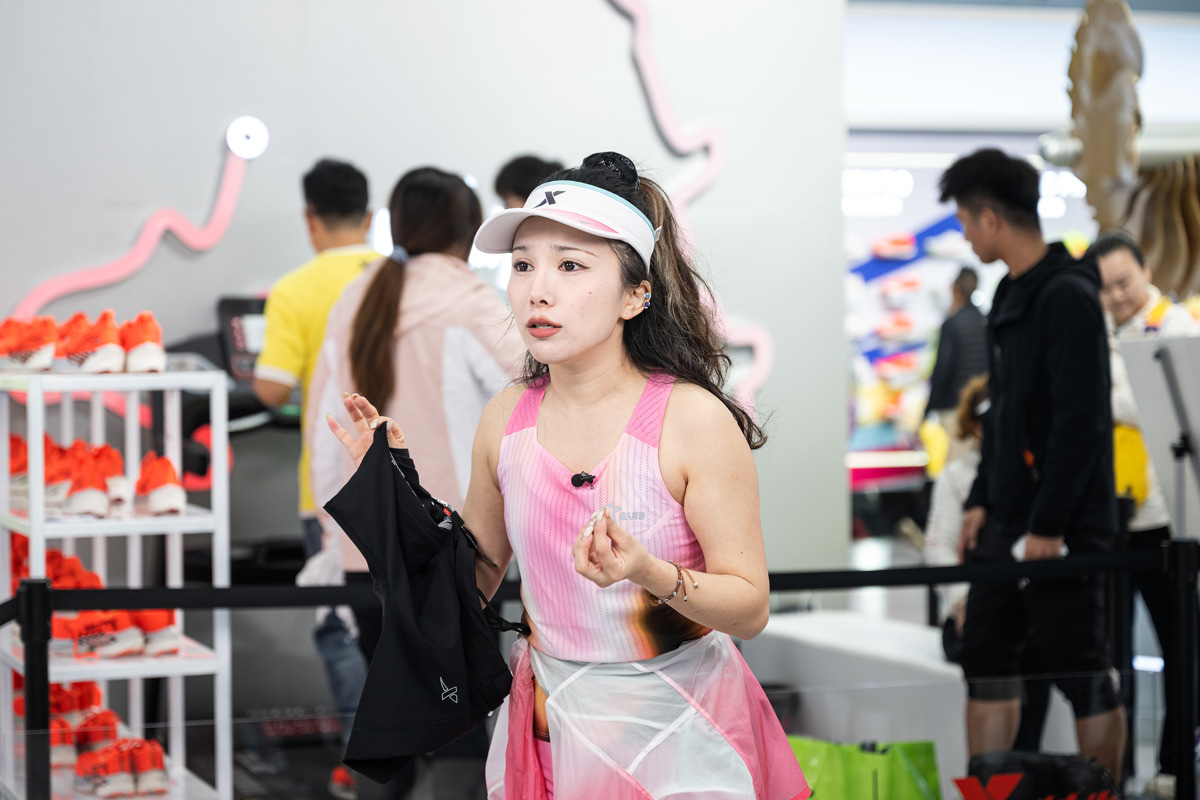 3月19日,主播在汉马体育消费博览会的展位前直播带货。(湖北日报全媒记者 任勇 摄)(湖北日报全媒记者 任勇 摄)