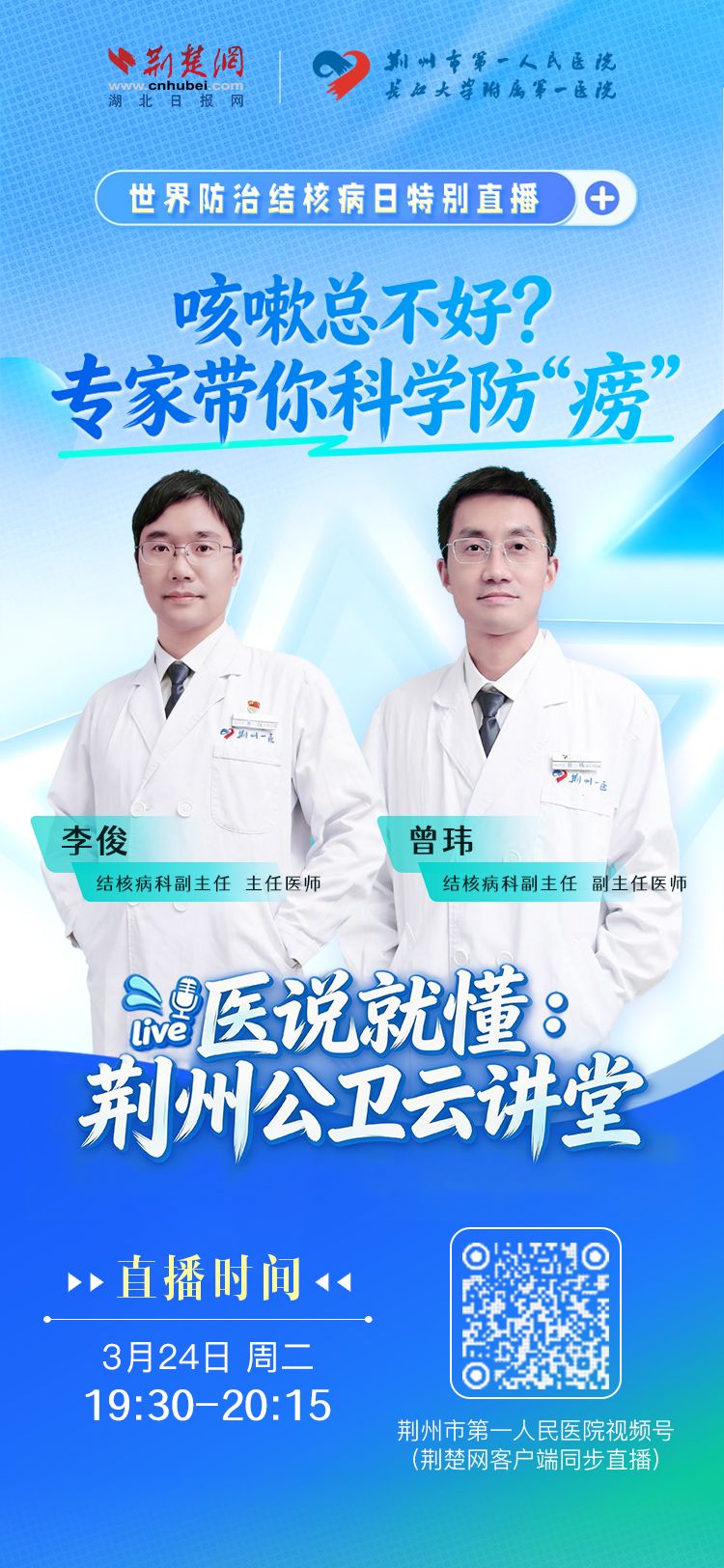 3月24日(周二)19:30,正值世界防治结核病日,荆楚网联合荆州市第一人民医院特别策划——世界防治结核病日特别直播《咳嗽总不好?专家带你科学防“痨”》。
